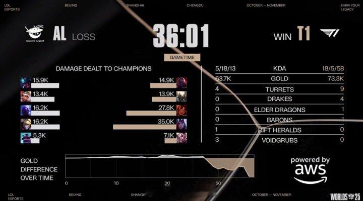 S15八强赛T1首局击败AL,Gumayusi首局使用韦鲁斯打出35k的全场最高伤害。