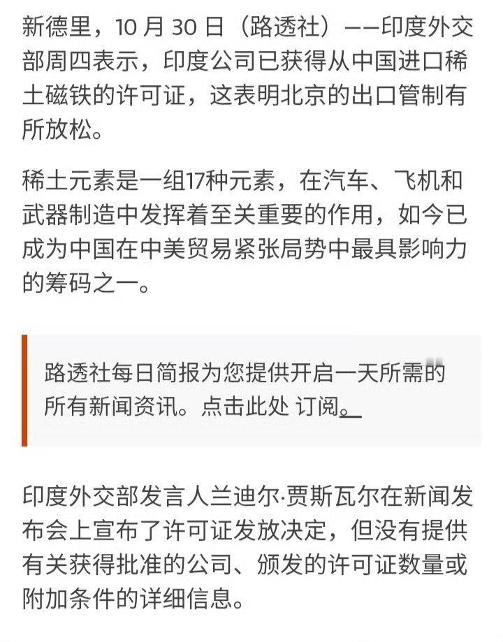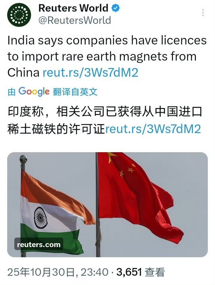 印度外交部周四(30日)表示,印度公司已获得从中国进口稀土磁铁的许可证。 烽火问鼎计划热点观点