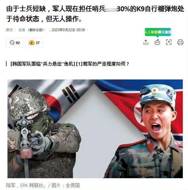继韩国海军严重缺编后,韩国陆军K-9自行火炮部队马上部署的新任下士跌破30%! 创下建军以来装甲·自行火炮部队干部任职率历史最低纪录!部分坦克和火炮几乎停用,