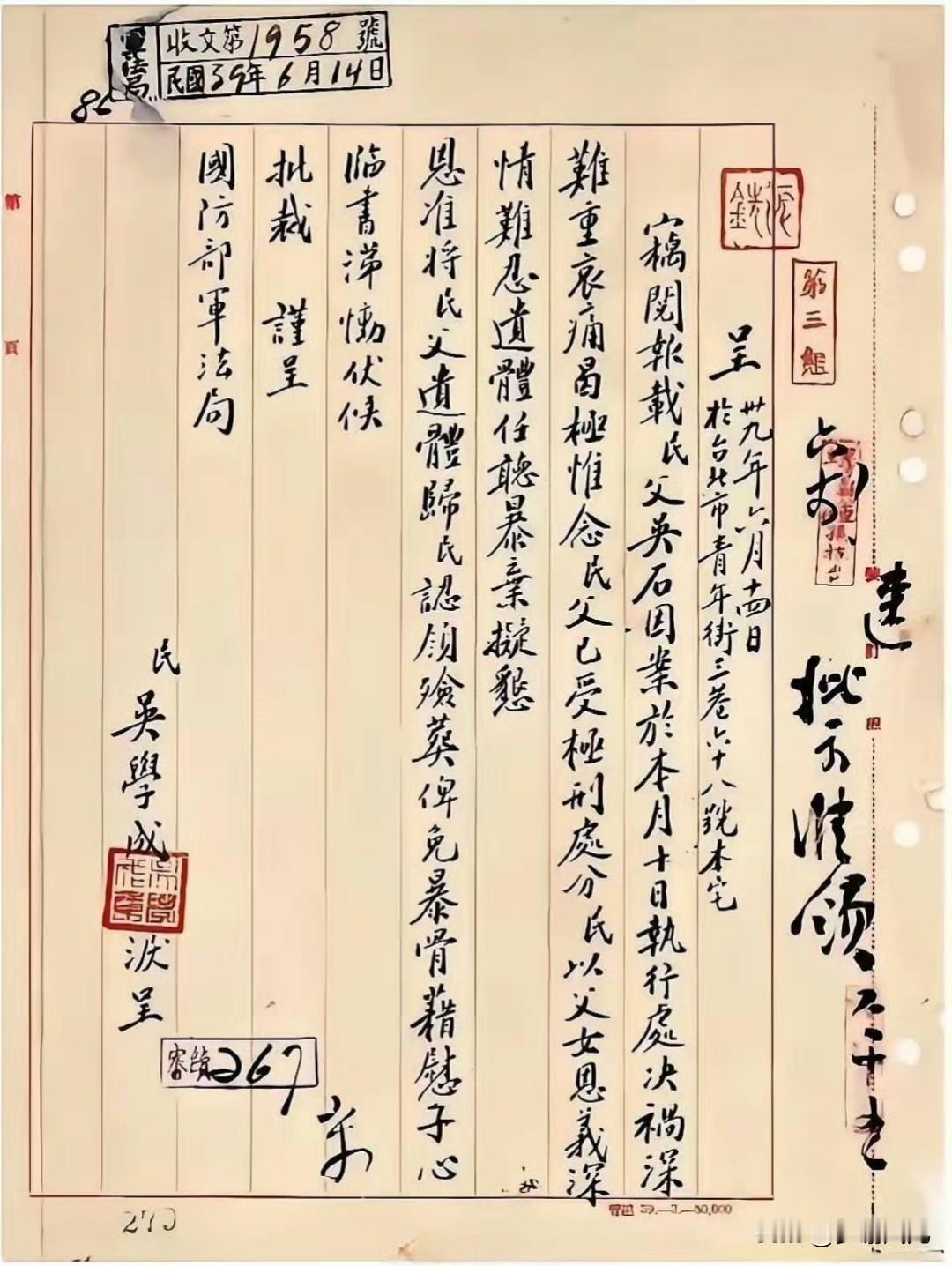 没想到能有幸看到关于吴石将军的领尸申请,对于革命先烈的伟大与不易更加感触! 申请
