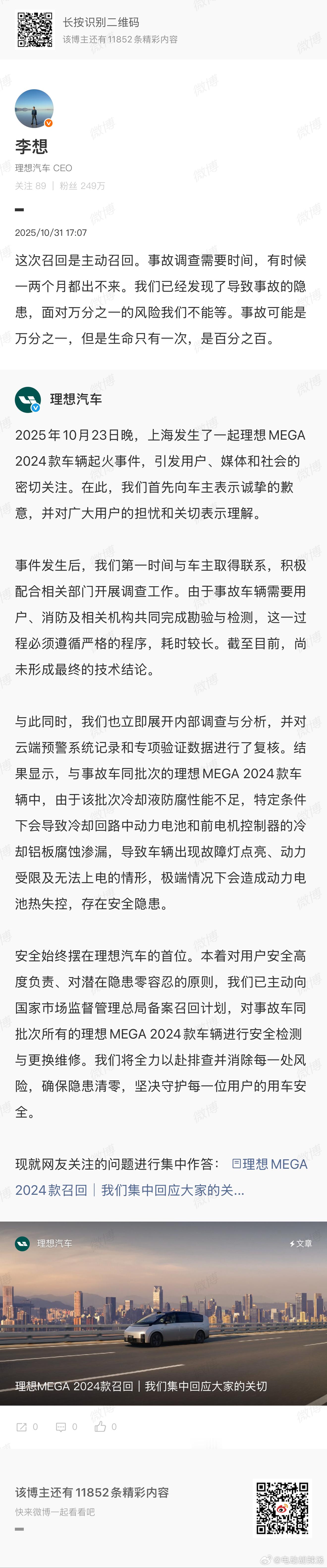 5、理想方面主动提出对2024年2月18日至2024年12月27日期间的理想MEGA 2024款进行召回,涉及更换冷却液、动力电池及前电机控制器,并为召回车辆提供原质保基础上2年4万公里的延保,等同于10年或20万公里保修。