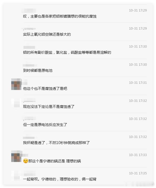 网络上讨论还是很多的,比如聊天记录里这位腐蚀科学与防护的专业人士就表示倾向于是电池包散热铝板腐蚀的问题~