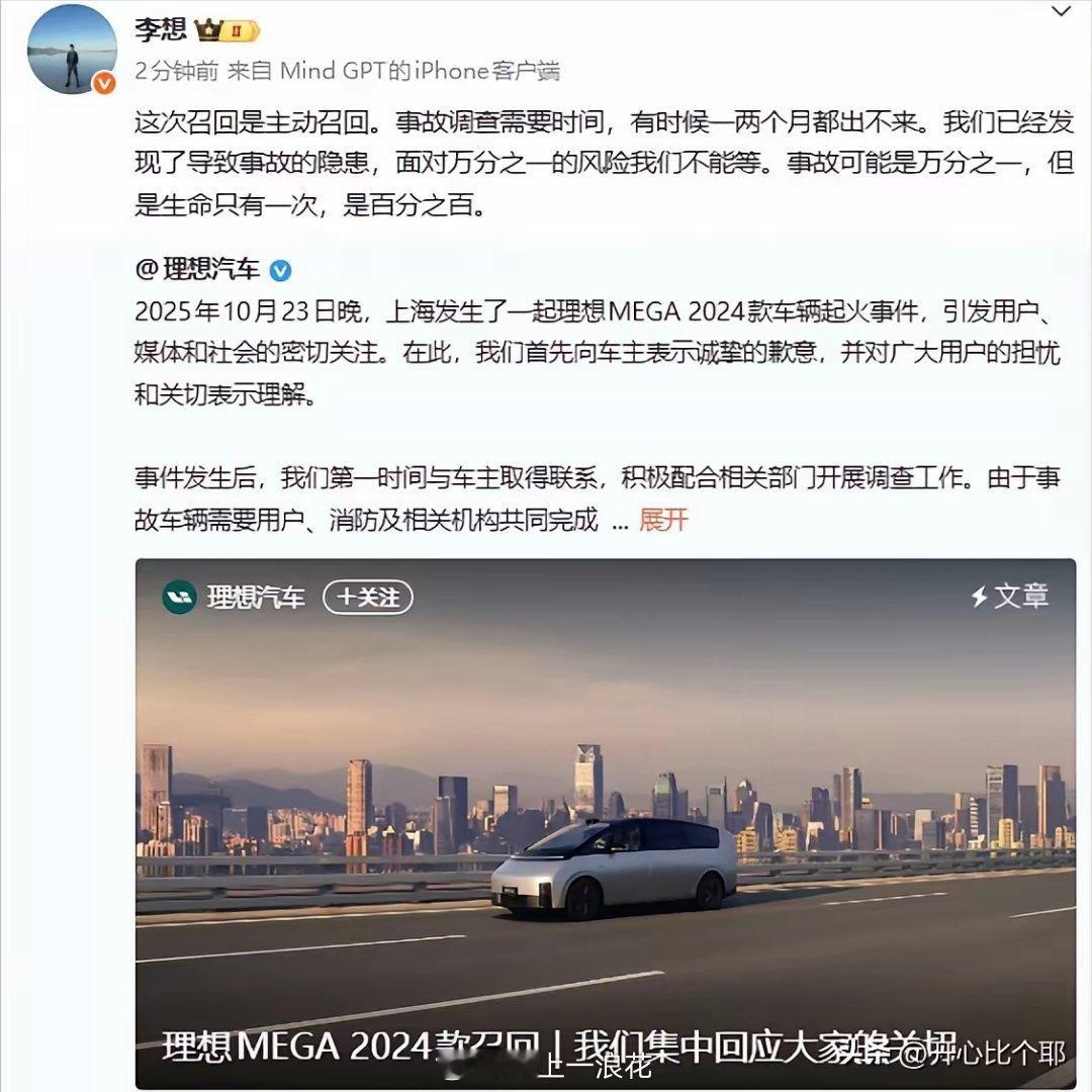 新能源汽车电池的安全问题需要从国家层面出台更严格的规范标准,让新能源车不仅科技环保,而且更加安全,而不是天天喊着遥遥领先。新能源车企也要从消费者的角度,增强责任意识,为消费者制造更加安全的汽车,而不是一出事就抠标、公关媒体,法务让消费者闭嘴。理想回应MEGA车辆起火