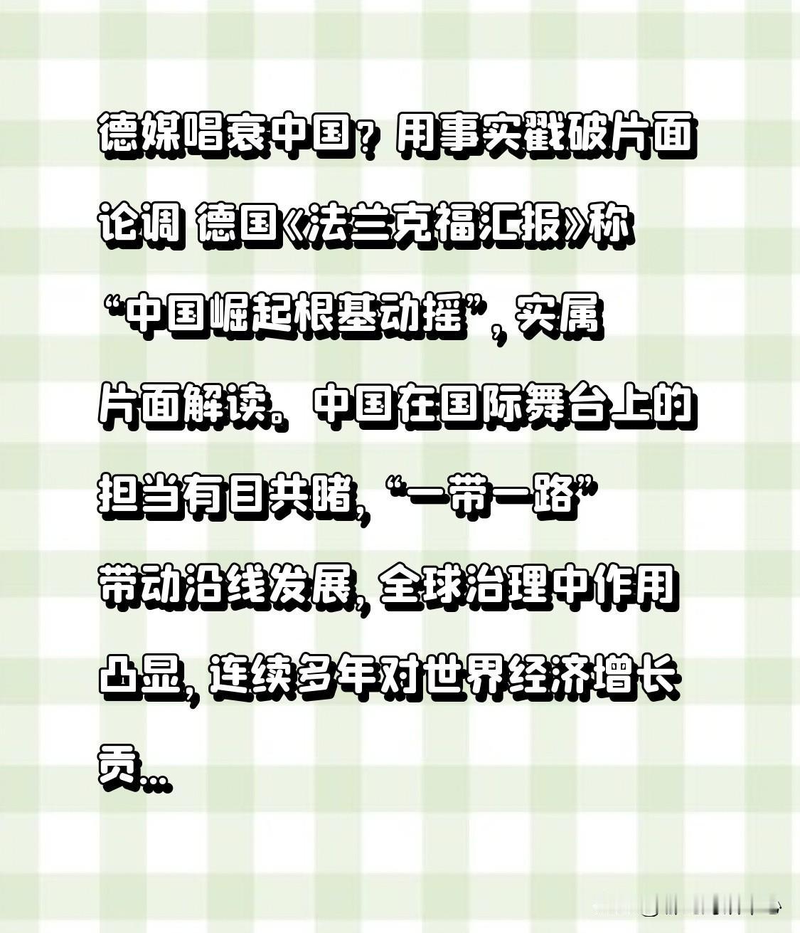 德媒唱衰中国?用事实戳破片面论调 德国《法兰克福汇报》称“中国崛起根基动摇”,实属片面解读。中国在国际舞台上的担当有目共睹,“一带一路”带动沿线发展,全球治理中作用凸显,连续多年对世界经济增长贡献率超30% 。 所谓“结构性问题”,中国早已主动破局。经济上,产业升级成效显著,2025年前三季度新能源汽车、动力电池物流量分别增长29.7%、46.9% ,5G、高铁等领域领跑全球。社会层面,10.74亿人纳入基本养老保障,城镇新增就业超千万 ,老龄化应对有序。环境上,生态文明建设推进,绿色产业蓬勃发展。 发展中的问题需辩证看待。2024年中国经济增长5%,彰显强劲韧性 。中国经济是大海而非小池塘,能在风浪中稳健前行。德媒只看挑战忽视对策,事实终将给出最有力的回应。