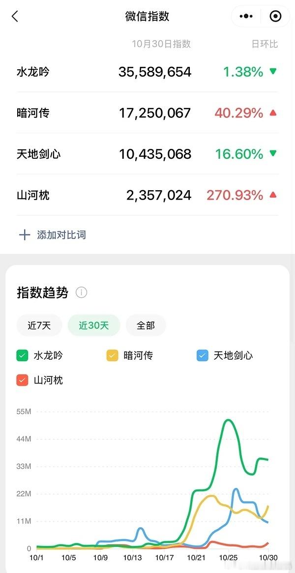 10.30日,水龙吟微指在四宝里遥遥领先,暗河传微指增长幅度很大,天地在平台热度