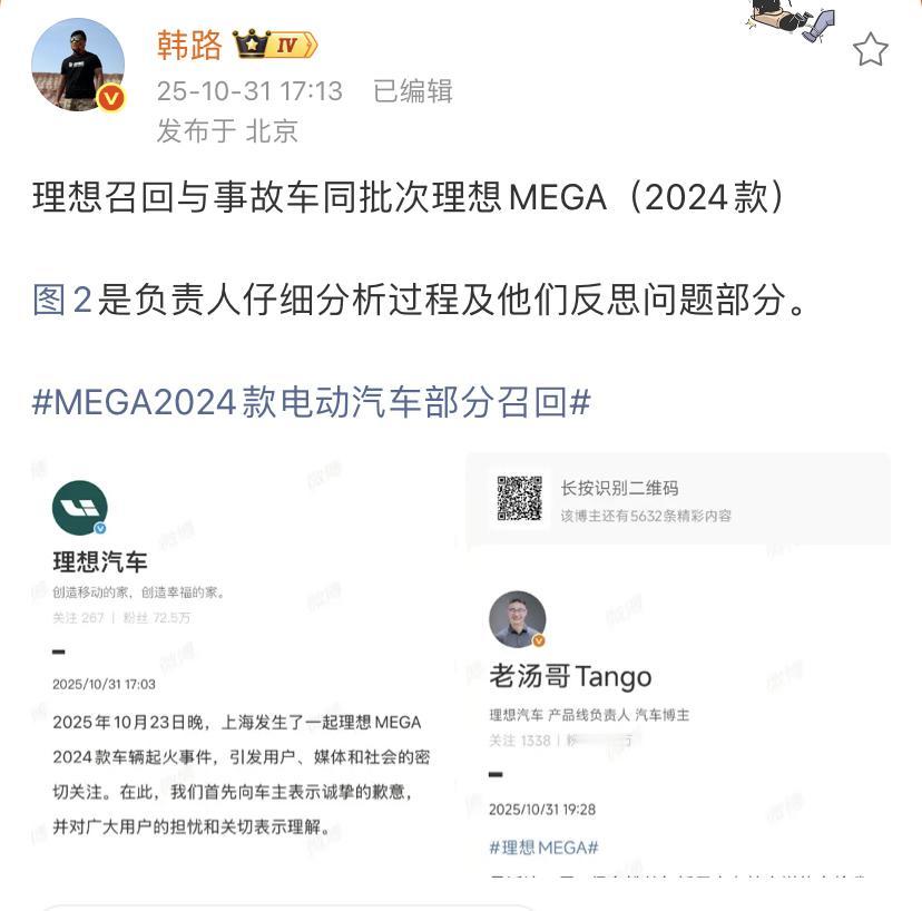 韩路:理想召回与事故车同批次理想MEGA(2024款) 图2是负责人仔细分析过程及他们反思问题部分。 这次理想搞得还挺积极的,并没有在第一时间回应,可能也是回应也不没有什么好结果,这一次的回应直接宣布召回了。 这个电车安全风险真的是一点不能出,这一次事件还好,车上是两个年轻人,跑得还非常的快。