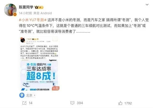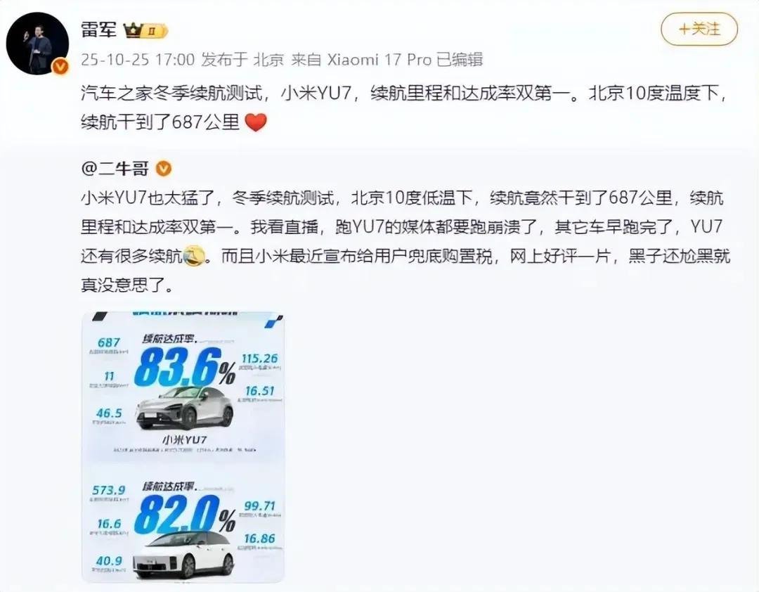 被雷军吹爆的小米YU7,大佬一句话戳到痛处。前几天汽车之家搞了个所谓的汽车冬测,拉上了小米YU7、理想i6和特斯拉Model Y三款热门车型。结果是小米实测续航687公里,续航达成率83.59%,拿下续航里程和达成率两个第一。看到这个消息的雷军,迫不及待分享了这个好消息。 可就是这事,却被车圈大佬拆了台。前不久开大劳出事的陈震,一针见血的指出,10度的气温条件下叫冬测,就是在误导消费者,理论上0-10度情况下电池续航才可能有衰减。言外之意,汽车之家搞的这个所谓冬测,没有什么实际意义。 这话也说到了用户的心坎上,北方真正的冬天都在0度以下,这种天气条件下看车辆的续航才有参考价值。而冬季的续航直接腰斩,其实也是不少人不买电车最大的顾虑。真要让大家信服,只有拿出技术搞定电池在低温条件下的续航难题,单纯的在宽松条件下搞续航测试,用户早已审美疲劳了。