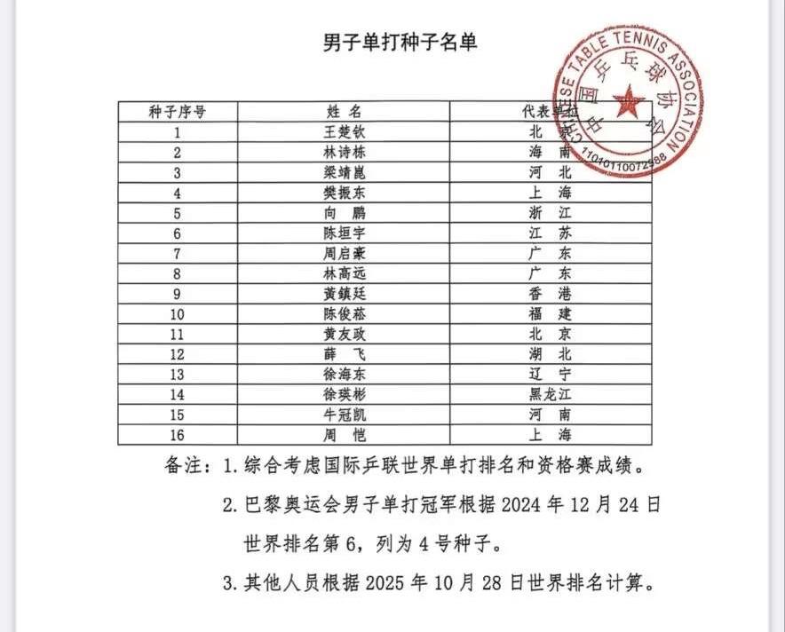 全运会男女单打种子名单已确定: 孙颖莎王楚钦为一号种子, 巴黎奥运会单打冠军恰好都是四号位。 这一看就是ctta的风格,这份名单绝对没错, 根据24年12月24号的世界排名落位。 种子位肯定是要有的,在哪里都没关系, 这个,大家也没必要有异议, 难不成从资格赛开始打起啊, 那真的不合适。 今年的全运会会很好看, 大家也都在等待精彩的开始。 一起加油哦。