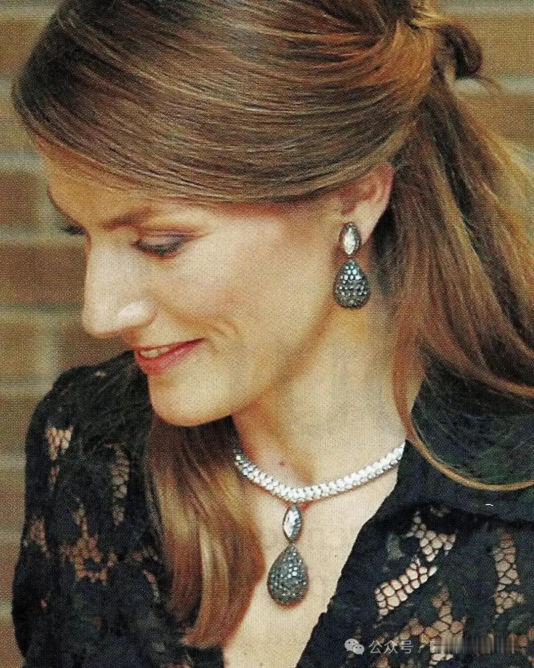 西班牙王后莱蒂齐亚的黑钻套装,包括项链和耳环,据报来自De Grisogono,搜了下这是家瑞士珠宝商,创始人+老板法瓦兹·格罗西本身就以对黑钻的研究和收藏出名 这两件套出现得很早,莱蒂齐亚刚进门的时候,即0405年那会就戴了一两次。中间冷宫了好几年,2014年开始又陆陆续续开始戴耳环(她很不喜欢戴项链) 近年因为偏爱暗色系,有些隆重场合也会把这耳环挖出来。看着乌漆嘛黑的真不太能欣赏,项链看着也比较丑