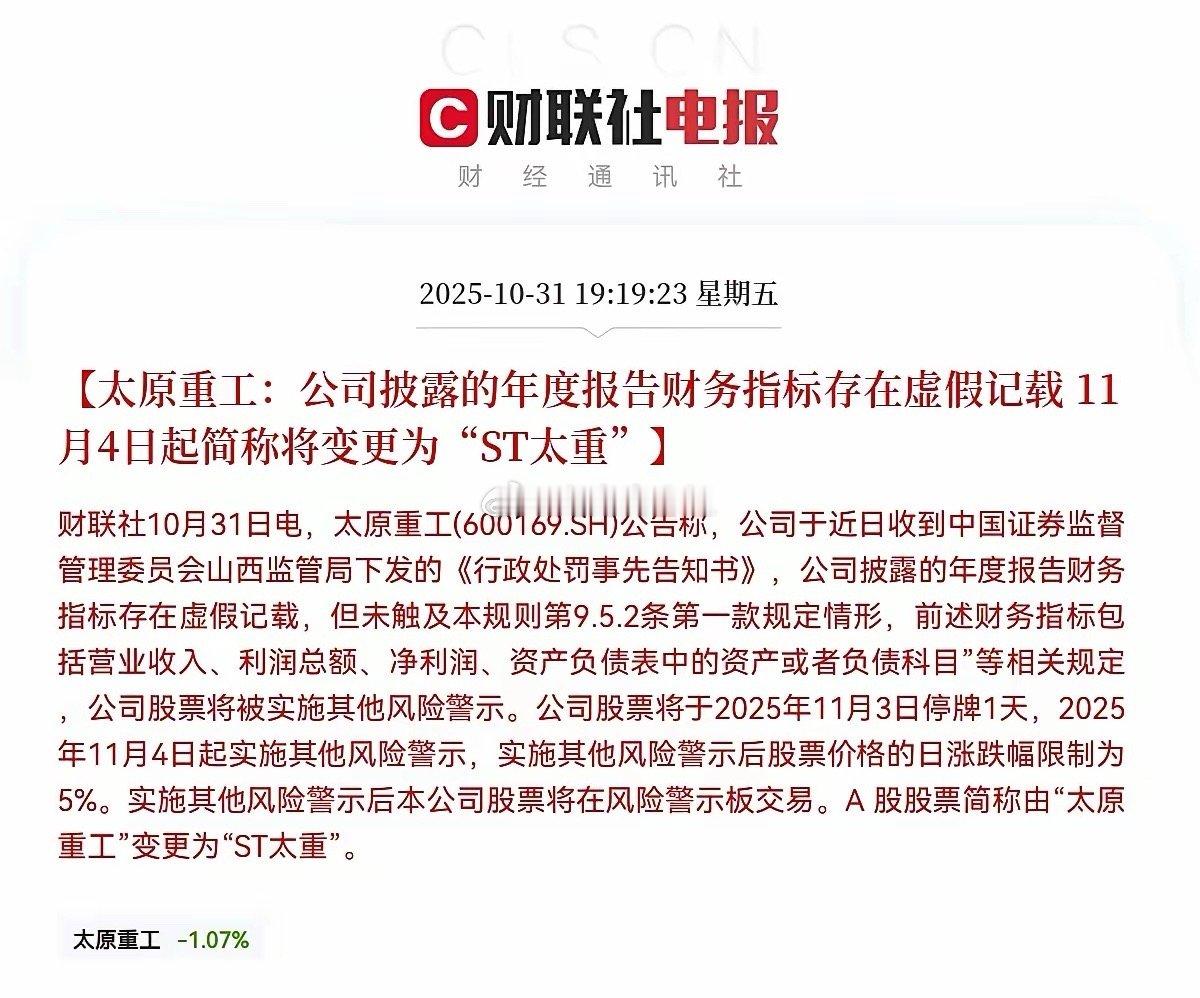 晚间7点19分,太原重工发布公告称:公司披露了年度报告财务指标存在虚假记载,11月4日起简称将变更为“ST太重”