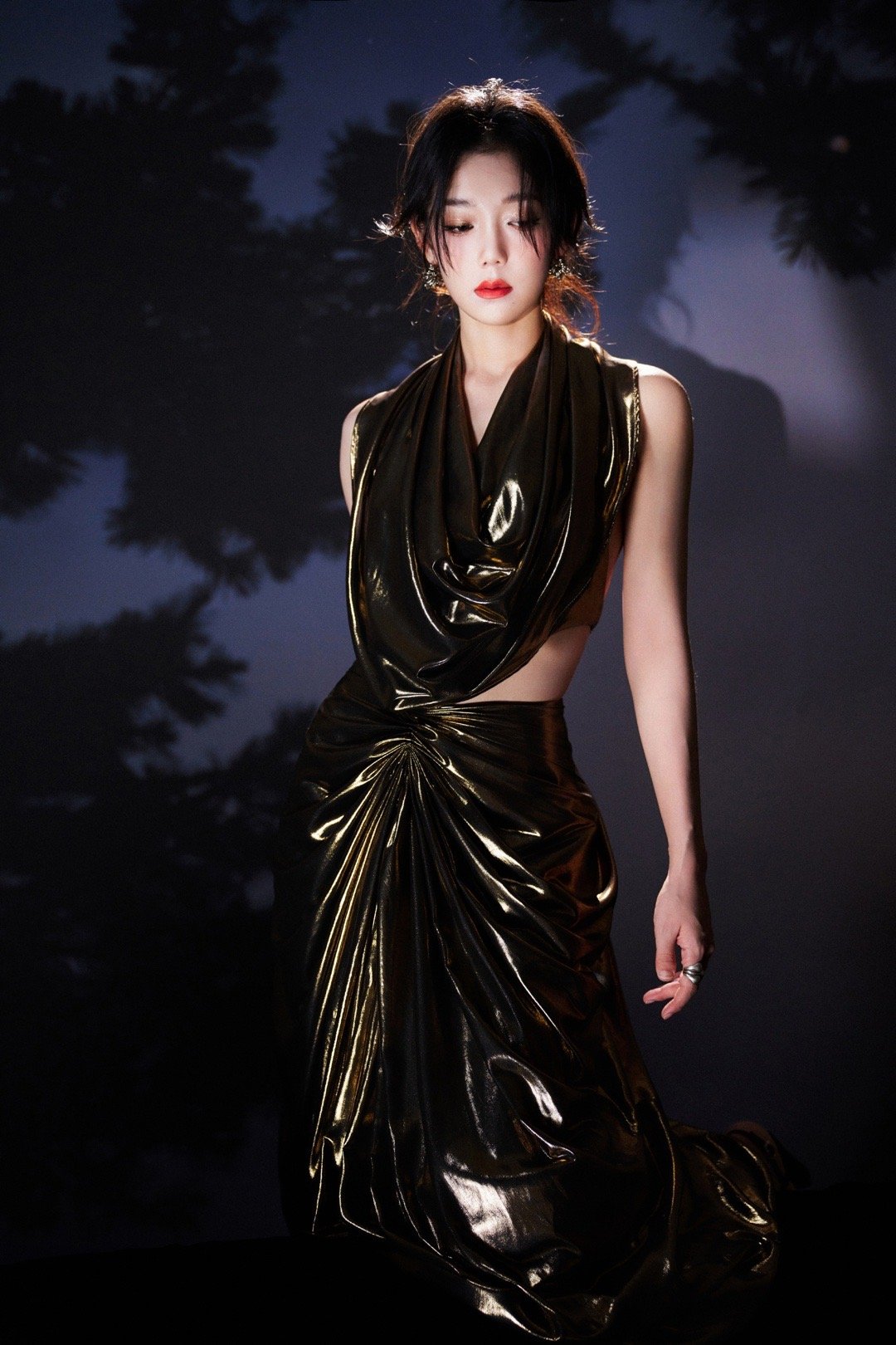 希林娜依高月光神女这造型也太绝了!鎏金裙像月光织的,冷雾感裹着温柔,烛火下唱歌的
