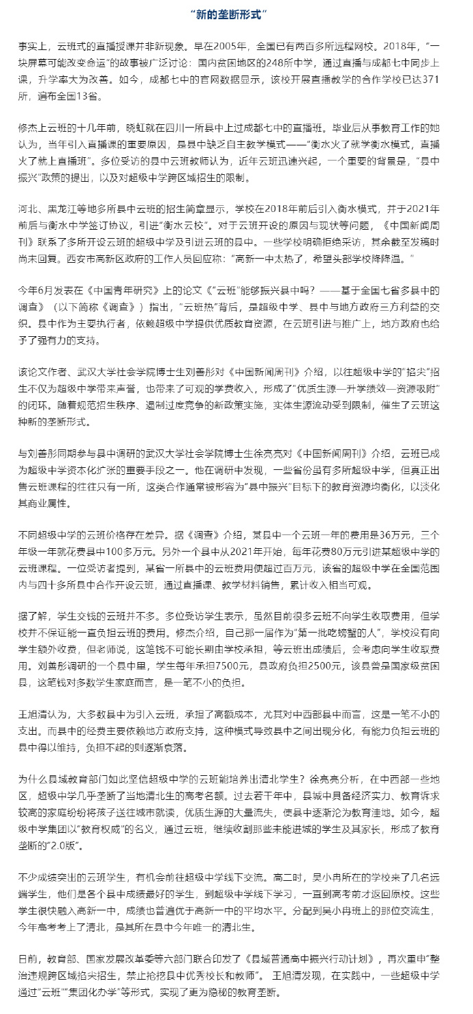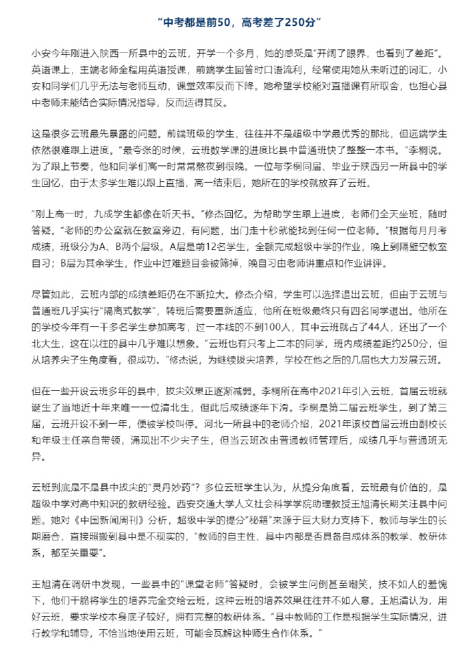 【#云班拔尖能否帮县中培养更多清北生#】#云班同学中考都是前50高考差了250分#阜城是河北省衡水市下辖的一个县城,常住人口二十多万。2023年9月,阜城中学与衡水中学旗下的“衡中云校”合作,成立了阜中云班。云班所在教学区与校内其他建筑隔着一扇铁门,门上挂着“学在云班 问鼎清北”的标语。该校云班位于一栋名为“清北楼”的建筑内,楼上悬挂标语“家门口的衡水中学”。该校的宣传资料写着,通过与衡水中学合作,云班实现了直播授课,在教研、教学设计、授课、作业等八个环节实现同步,在管理、标准、教材、教案等八个环节实现统一。这是很多县中云班的缩影。修杰是云班的典型受益者,也是县中最想拔尖的学生。他所在的高中位于西北地区,是一所典型的县中:在一个曾经是贫困县的小县城里,这是唯一的高中,师资薄弱,生源流失严重。修杰2022年成为该校首届云班学生。云班被安排在独立楼层,有单独作息和教学体系,学校把县内中考成绩最好的50名学生编入云班,就是为了出成绩。
