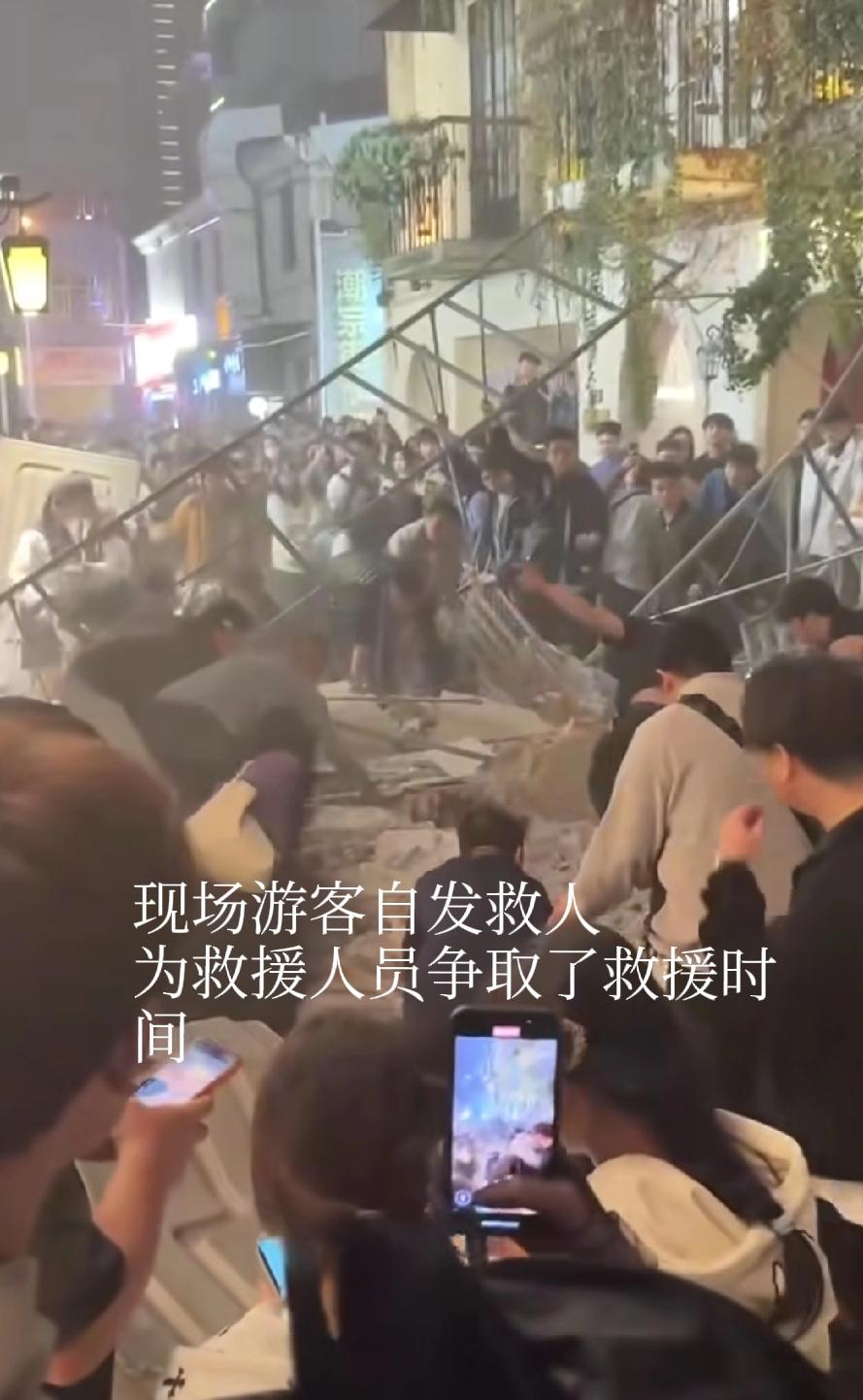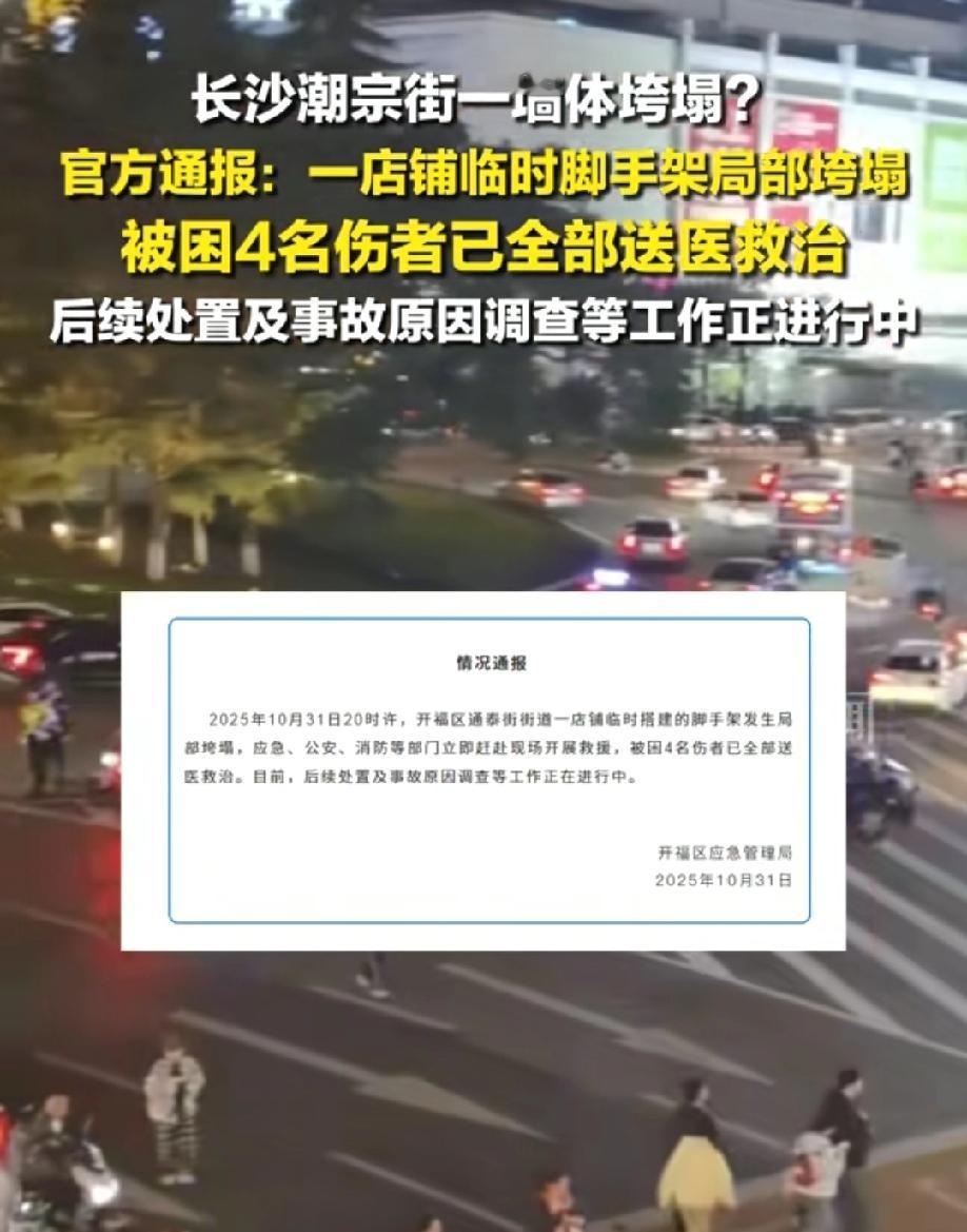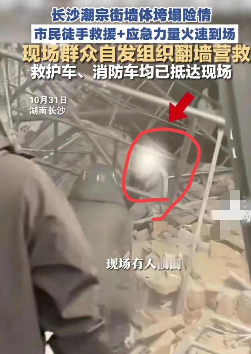 突发!长沙潮宗街出事故了 根据官方通报,是一店铺墙体倒塌,临时搭建的脚手架出现局部垮塌,4人受伤已送医院医治。 今天是万盛节,人流较大,墙体倒塌时有人被掩埋。 据网友发布的视频显示,现场一片混乱,还有一女子哭很伤心,坍塌的废墟中有被困人员,现场人员自发组织救援,大家徒手搬砖、抬铁架子救人。 有目击者透露,他们就在旁边拍照,墙体就在眼前倒塌,想想都后怕。 目前事故原因还在调查中,愿所有人平安!