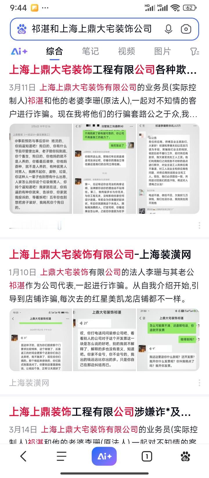 有计划在上海装修的必看 刘老汗装修纪实(6)——痛定思痛的教训 这次装修,被祁总骗去的资金10万左右,付了19.5万现金,间接损失20万以上。值得总结的教训。 祁总的口才极好,他能投人所好,让人在不知不觉中上当受骗,他在美信优家买到信息,然后想法上门推荐自己,自我介绍是北京大学(或南京大学)艺术系毕业,他老婆李x是复旦大学毕业,现在是东亚银行付行长,他的丈人是做饲料的企业家。 骗子在与时俱进,用互联网信息行骗。我们需要装修者可能把大把的时间用于选择装修材料上,对最重要的装修公司的真伪,装修公司的负责人是否骗子缺乏警惕。看了刘老汗装修纪实的读者,记得在签合同付款前在百度查一下,在deepseek,在上海装潢网上查一下,这家公司的名字和签合同者的名字,你大概率可以避免受骗。在百度输入祁湛和上海上鼎大宅装饰公司百度给出的是: 上海上鼎大宅装饰工程有限公司各种欺... 3月11日 上海上鼎大宅装饰有限公司的业务员(实际控制人)祁湛和他的老婆李珊(原法人),一起对不知情的客户进行诈骗。现在我将他们的行骗套路公之于众,我... 3月6日 中午12:16 ■■别墅施丁沟通醒4 祁湛李珊欺诈坑人(17) 上班整装(一流设计+最实惠施工) 不具备施工的能力了。 不用抵赖了都有据可查的,你公司 公告 @事前预防与事后弥补姓沈的, 各位供应商、师情及业主朋友们 祁湛:你妈逼知道吧!狗日的, 祁湛:节目尽管使出来,老子陪你玩到底, 你个畜生,狗日的,你他妈的就不 你既然这么说. 受骗业主:欺骗我们业主的钱财 收款后却不履行工作,拒付供应商 款项,拖欠甚至克扣工人工资。 业主:孬种,就不是人养的,有种就男人 住脚还是我们的合同立得住脚 不靠谱,对工人说业主和供应商有 进行欺诈,对业主说工人和供应商 对男人,我瞧不起你,废物,垃圾, 问题,对供应商则诋毁业主和工 祁湛:妈个逼知道吧!我家就在这,你 我投诉的,等着拆吧!五年你也别逼的有种你就来,告诉你,你家就住。第二,我拘留多长与你无关与你工程无关,想把房子装好,我耗死你个狗日 状。 上海装潢网 上海上鼎大宅装饰有限公司-上海装潢网 1月10日上鼎大宅装饰有限公司的法人李珊与其老公祁湛作为公司代表,一起进行诈骗。从自我介绍开始,引导到店铺诈骗,每次去的红星美凯龙店铺都不一样。 上海装潢网 上海上鼎装饰工程有限公司涉嫌诈*及... 3月14日 上海上鼎大宅装饰有限公司的业务员(实际控制人)祁淇和他的老波李珊(法人) 在中国执行信息公开网查到时信息 执行人 被执行人姓名/名称: 祁湛 身份证号码/组织机构代码: 320723198903133810 执行法院范围: 全国法院(包含地方各级法院) 姓名 立案时间 案号 祁湛 2024年8月12日 (2024)苏0213执5537号 祁湛 2023年5月11日 (2023)苏0213执3361号 祁湛 2023年3月28日 (2023)苏0213执1903号 祁湛 2024年3月21日 (2024)苏0206执1547号 祁湛 2022年10月13日 (2022)苏0206执3790号 祁湛 2023年8月23日 (2023)苏0214执3116号 祁湛 2023年6月1日 (2023)苏0213执4156号 祁湛 2023年8月8日 (2023)苏0206执3119号 祁湛 2023年8月11日 (2023)苏0206执3183号 祁湛 2023年2月14日 (2023)苏0213执722号 如果你查到这些信息,你还会把合同交给祁湛和上海上鼎大宅装修公司吗。