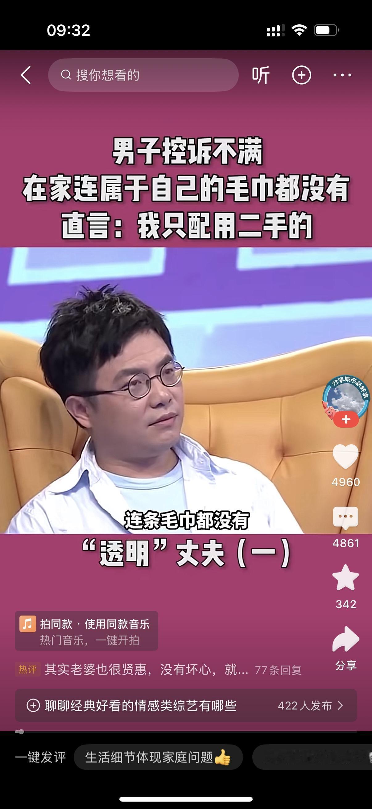 男子吐槽自己在家里没什么位置,用的都是二手的。妻子解释家里有两个小孩,小孩用旧的毛巾也没有坏,扔了可惜,就给丈夫用。男人说自己很久没有吃过鸡腿了。妻子解释两个小孩一人一个鸡腿,你作为父亲,吃鸡翅就可以了。男人还说自己没早餐吃。妻子解释早上本来就忙,送完大的,再送小的。自己只有时间给小孩做饭,大人随便凑合几口就得了。男人委屈极了,说有一次自己工作压力太大,回家后没有陪小孩玩。妻子就让他滚出去。 调解团听到这些都说是小问题。错了,这不是小问题。女人根本就没有把丈夫当一回事,她心里只有孩子。这样的女人不要也罢,她的心里根本就没你。