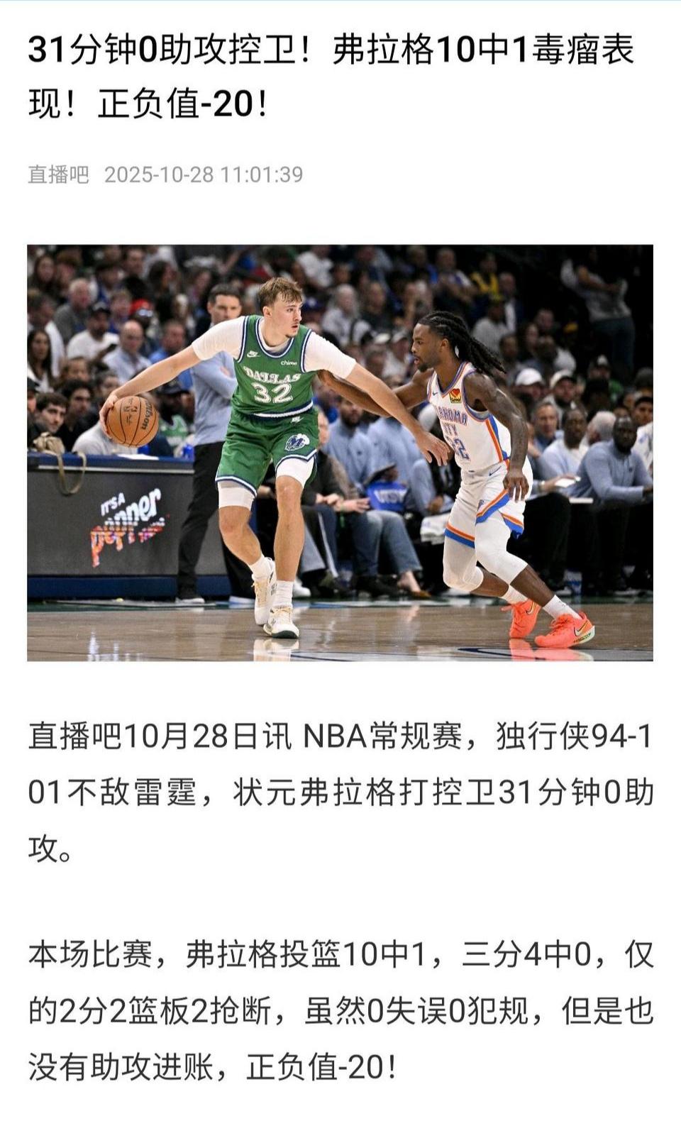 弗拉格不适合打控卫,投篮也不准都是缺点! 希望独行侠教练基德看清楚呀,球队赢一场输一场怎么进季后赛。 弗拉格场均13分6篮板2助攻,只有41%命中率,控卫不适合他,要是没有快攻灌篮命中率更差。 超级状元慢慢来,感觉进攻跟文班亚马比不了。[可怜]