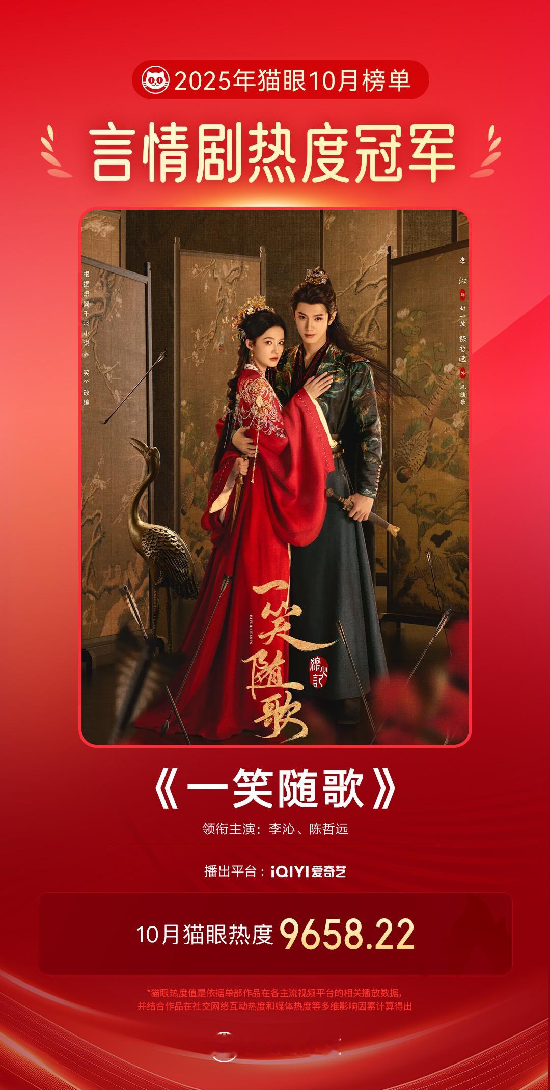 一笑随歌[超话]一笑随歌10月言情剧热度冠军 据猫眼专业版数据见证,领衔主演网络剧《一笑随歌》10月猫眼热度值9658.22,成为2025年10月言情剧热度榜冠军!猫眼10月剧集热度榜