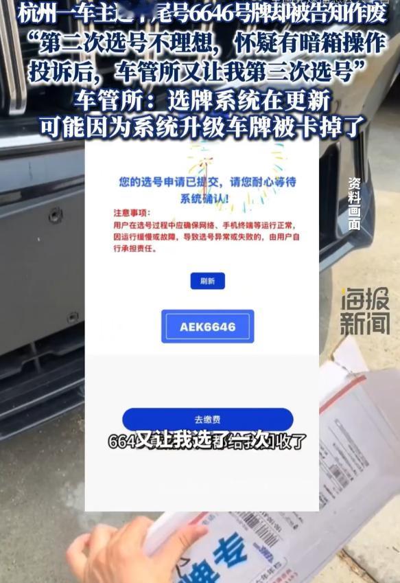 “这么巧合吗?”浙江杭州,男子买了新车后到车管所选号,在一众随机数字中,第一眼就相中了尾号“6646”的车牌,可当他提交缴费时,却被告知号码作废,需要重新选号,可看看下一组的号码,他怀疑这里面可能存在暗箱操作。   男子刚买新车,他攥着材料站到选号机前,心里早把带6、8的数字默念了好几遍,屏幕数字飞速滚动,他眼都不敢眨,直到停止的瞬间,尾号6646的浙A车牌一下撞进眼里。   这号码在一堆杂乱数字里太扎眼,读着顺口,还透着“顺顺利利”的意思,男子没半分犹豫,指尖飞快点下确认,生怕慢一秒就没了,还特意掏出手机截图,画面里6646的字样清清楚楚。   揣着截图往缴费窗口走,脚步都轻快,琢磨着这车牌往新车上一挂,多气派。   窗口里的工作人员敲了几下键盘,抬头却说这号用不了,系统判定作废了,男子当场僵住,手忙脚乱翻出截图:“我刚选成功的,怎么会作废?”   工作人员解释,大概率系统当时在升级,号码被“卡掉”,属于意外故障,让他重新选号,还说会协调帮他选个满意的。   重新滚动的号码出来,男子扫一眼就皱紧眉头,一堆数字不是带偏僻组合,就是谐音别扭,跟之前6646比差太远,他越想越不对劲,这故障来得也太巧,刚选中心仪的号就出问题?   周围有人凑过来议论,说选车牌最上头,看中的号没了,比丢钱还难受,有人搭话,自己之前也遇过系统异常,折腾半天才重选,糟心透了。   这话戳中男子心事,他盯着选号机,脑子里全是问号:真就这么寸,偏在选到好号时升级系统?   车管所这话不是第一次说,2021年12月,杭州另位胡女士在APP上选到尾号555的连号,缴了制作费和快递费,第二天系统直接变824,当时给的说法也是系统延迟、号码没传成功,最后双方僵在协商里。   有人说这是小概率事件,可男子看着眼前的“烂号”池,实在没法信服,毕竟车牌作废多跟违规沾边,要么出租指标被查,要么车辆注销没收回号牌,系统升级卡掉好号的情况确实少见。   而且按规则,只有用户逾期不办手续,号牌才该作废,他全程合规操作,凭啥要受损失?   更让人犯嘀咕的是,全国统一交管系统号称自动收号放号,地方车管所没权限人工干预。   那系统升级前咋不提前说?出了问题只让车主重选,连点实在的补救都没有,之前江苏南通女工摇中5个8的车牌,车管所立马说系统没问题全靠运气,怎么到这儿就全是故障?   男子最终还是从新号里挑了一个,可心里那股别扭劲散不去,这事传到网上,不少人跟着吐槽:“关键时候掉链子,选号这么重要的环节,升级系统不能挑没人的时候?”   还有人说,不是不信系统故障,是希望出问题后能有实在说法,比如优先保留选号机会,而不是让车主白白受委屈。   选车牌本是开心事,却因为一场“巧合”的系统故障变了味,大家纠结的从来不是一个号码,而是对选号公平的期待。   要是系统总在关键时候“掉链子”,补救又跟不上,难免让人往暗箱操作上想,毕竟规矩摆明了,保障也得跟上,才对得起车主那份信任。