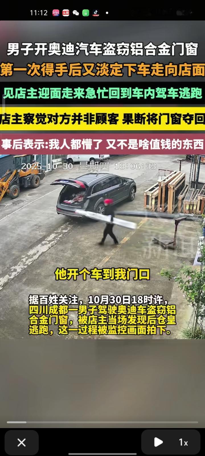 10月30日,四川成都。一男子开着奥迪车来偷铝合金门窗,被店主抓个正着。监控画面显示,男子头戴红色帽子,面戴口罩,把车停到一家店门口,淡定走下驾驶座,打开后备箱,将店前成捆的铝合金门窗搬入车内,随后回到车位上又走出,没想到刚好被店主撞个正着。 店主尹先生表示,起初看到该男子下车,以为是前来光顾的客户,看到他把店里的铝材装进车内,于是便出门查看,男子见状仓皇逃跑,店主从奥迪汽车未关闭的后备箱中夺回被盗物品。目前已报警,公安机关正在处理。 要我说,开着这么好的车,干着这样的勾当,真是应了那句老话“人不可貌相”。这种案件提醒我们,不管对方的穿着、交通工具看起来多体面,都不能放松警惕。防人之心不可无,尤其是在店铺经营、物品摆放等方面,最好有一定的防盗措施。 最后,也希望警方能尽快查清男子的动机和背景,依法处理,让类似的盗窃行为得到有效遏制。