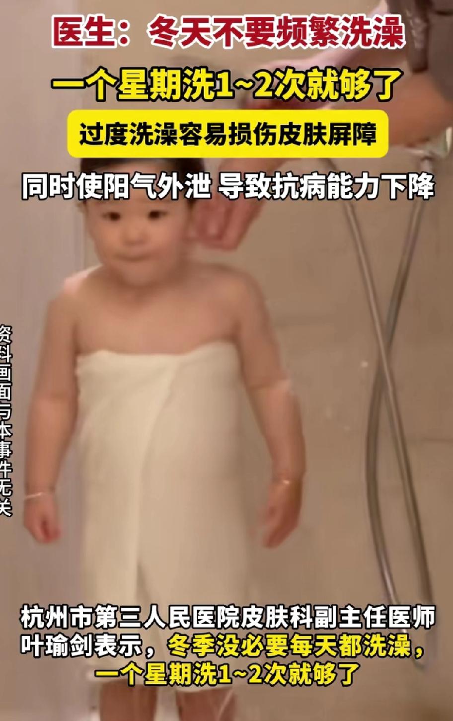 涨知识了 医生建议,冬天不要频繁洗澡 一周洗1-2次就够了,如果频繁洗澡容易损伤皮肤屏障,使阳气外泄,导致抵抗力下降。 所以说,有时候太过干净反而影响健康,任何事情都要适量就好,太多或太少都不利于健康。 你们说是这个理吗?