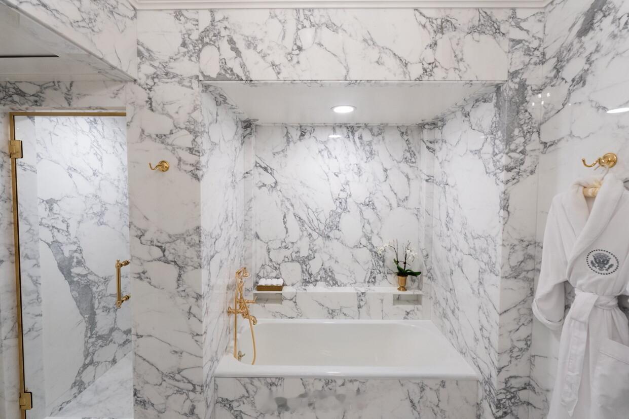 特朗普展示其在白宫翻新的全新大理石与金色装饰风格 “林肯浴室”。