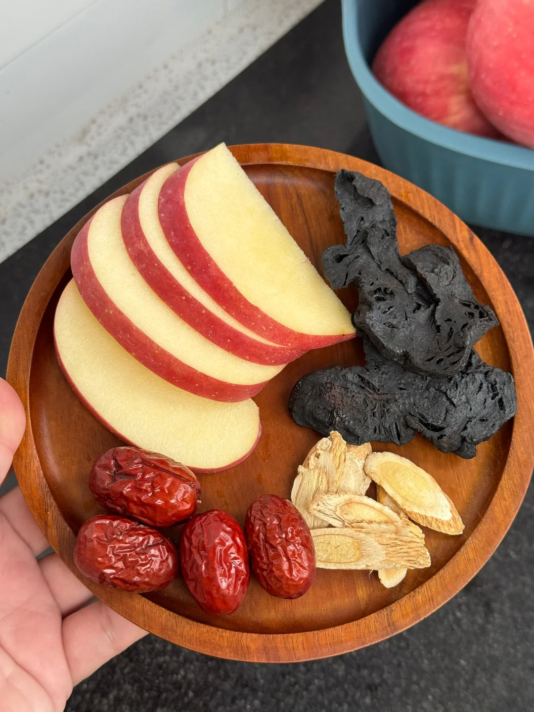 苹果一个、黄精10g、黄芪3g、红枣4个
