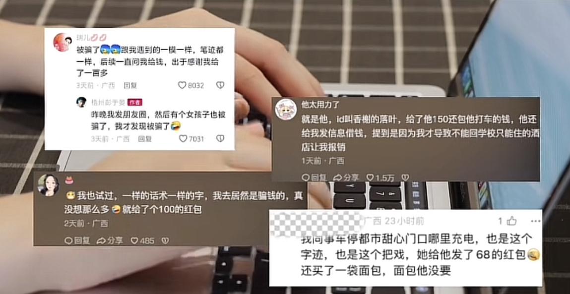 以为是感动中国,没想到是今日说法,在广西捡瓶子的老人最近莫名其妙背了好大一口锅。起因是广西梧州一位网友骑电动车去万达,停车时粗心未拔钥匙。等他晚上准备骑车回家时,发现车头挂着一个笔记本,里面留下了一段感人的话,大概内容是他的电动车钥匙没拔走,一个捡瓶子的老人想把他的电动车骑走,两个路过的好心人制止了老人,为了安全这个人拔下了他的车钥匙,并买了本笔记本给他留言,让车主到时联系他取钥匙。 车主看完留言后十分感动,立即拨打了上面的电话,对方态度良好,他告诉车主说车钥匙在其女朋友手中,自己等会先去取,然后再给车主送回来。没过多久,一名男生就骑着共享单车将钥匙送了回来。 顺利取回钥匙后,车子为了感谢他主动加了vx给他发了168块钱的红包。随后还这件事发到了朋友圈谢谢遇到的好心人,结果好友看到他发到内容后,在评论区留言说他也遇见过一模一样的事,甚至笔记本上留下的字迹都一模一样,加上联系方式,拿回车钥匙后,对方一直找各种理由借钱。 车子看到朋友留言后立马意识到不对劲,于是他在社交平台分享了这段经历,没想到评论区众多广西网友表示都遇到过相同的情况,甚至笔记本上的笔迹都一样,他们这伙人就专门找没拔钥匙的电动车,就连笔记本上的字都不是手写的,是机器打印的。他们不仅利用人们的感恩之心来获取感谢费,还要买笔记本的钱以及报销来回送钥匙的打车费。