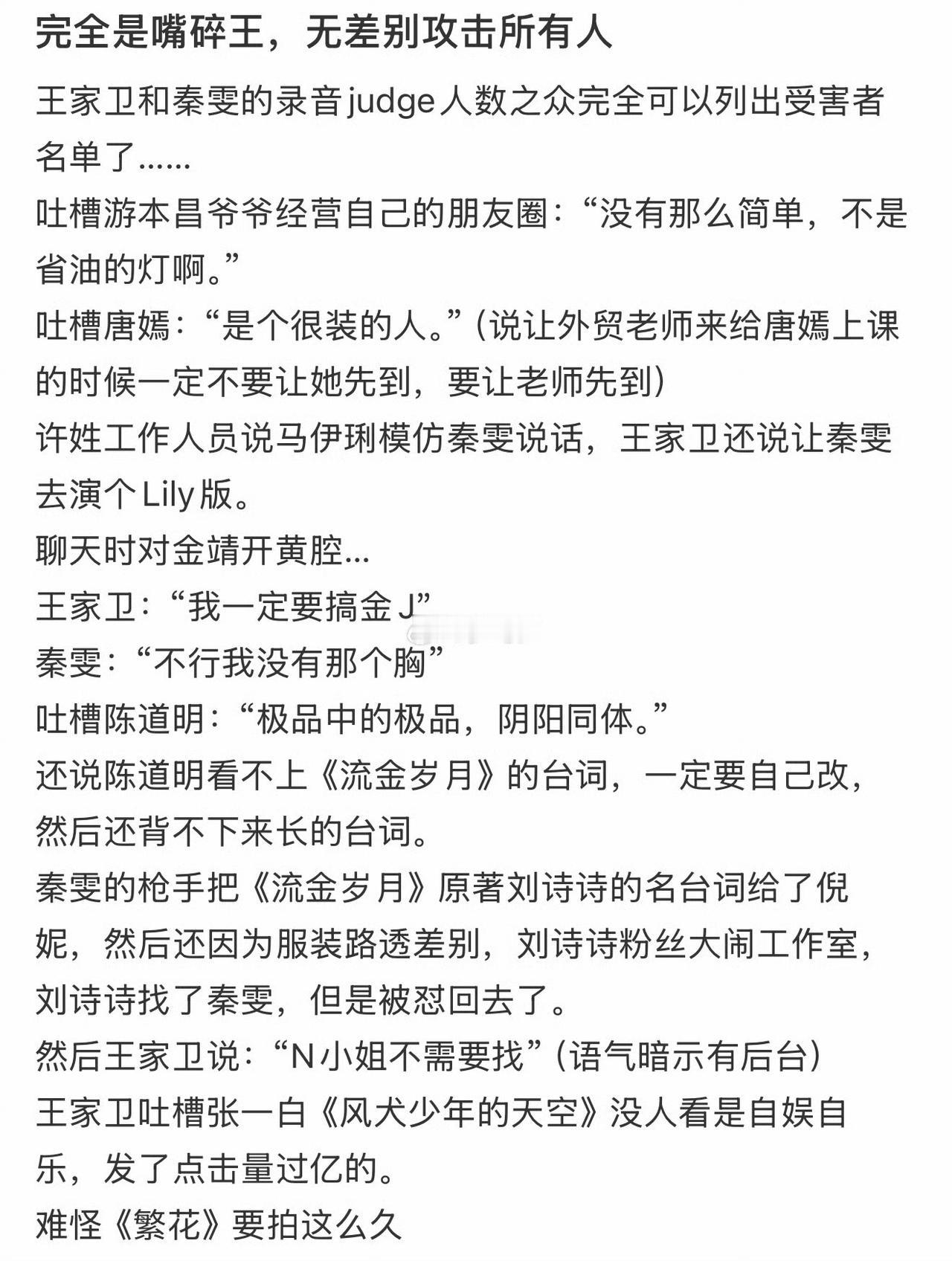 看完了王家卫和编剧秦雯的整段对话录音,彻底被他们的三观震碎了,怎么他们这么挑剔,《繁花》剧组无一人幸免,整个内娱明星都被他们diss了。 大导演和编剧的眼光和品味就是比较独特,很难有人能入得了他们的眼。 就连德艺双馨的老艺术家游本昌都没逃过他们的叨叨,更何况是年轻一些的陈道明,靳东唐嫣这些演员了。 我特别好奇,以后王家卫还想不想拍电视剧了,再见这些大咖位的演员们,他是否尴尬,又如何自处呢? 说实话,就我一个人觉得繁华不好看么,当时网上都在疯狂夸,我和我妈两代人都看不下去,觉得不好看。浮于表面纸醉金迷,金融部分还没有追风者有内涵。