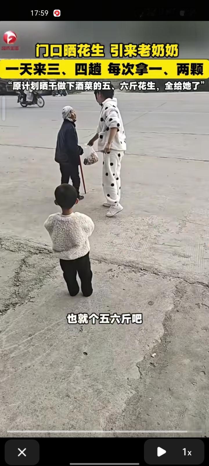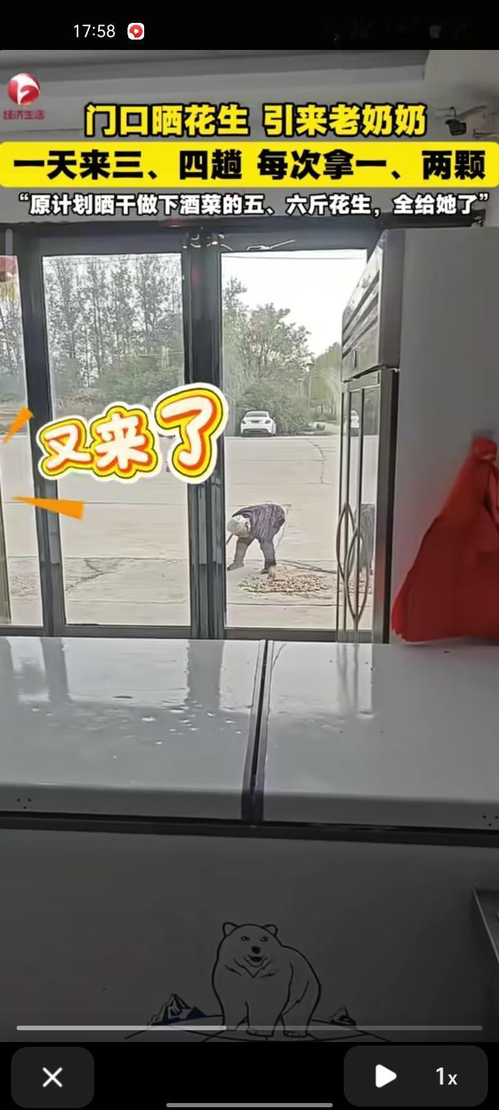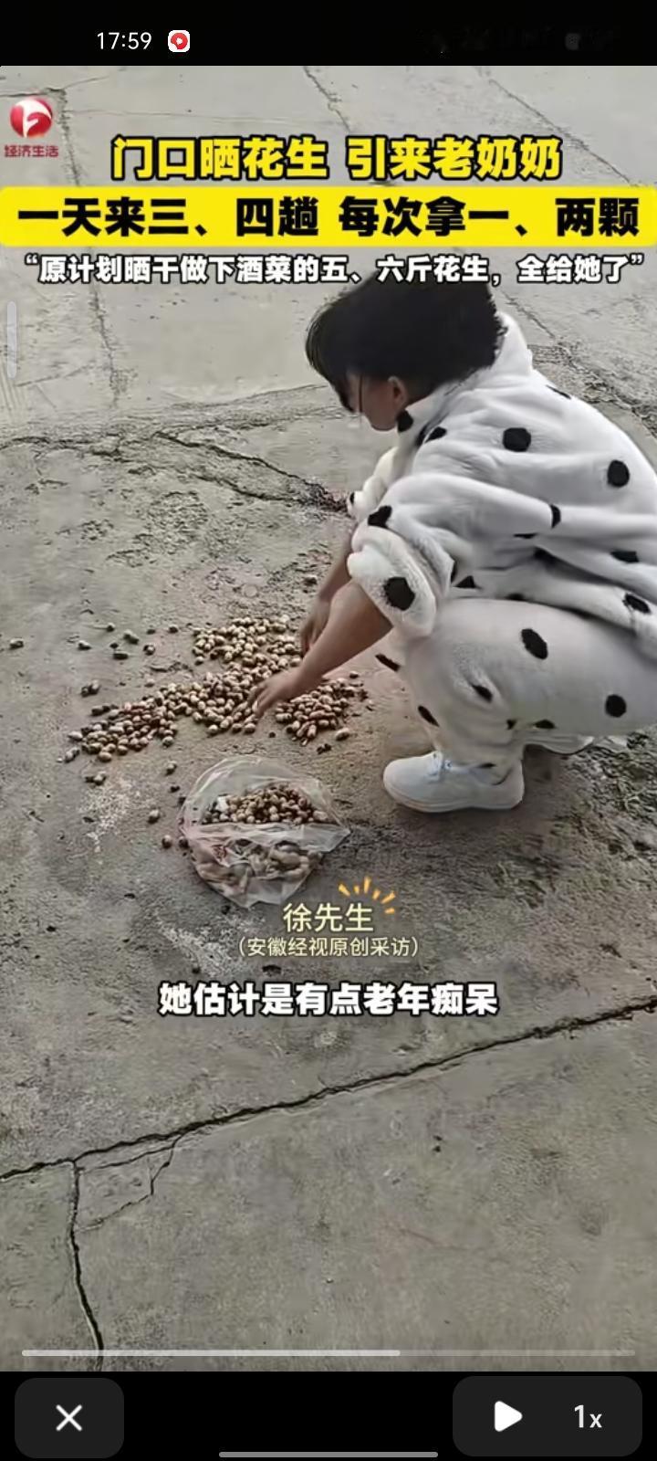 10月31日,周口市郸城县。网友发视频称,在店门口晒花生引来老奶奶来白嫖,一天来三四趟,每次拿一两颗。老奶奶可能患有老年痴呆,本来计划把花生晒干做下酒菜,六斤花生全给她了。