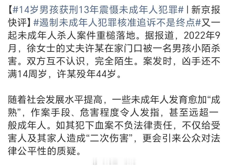 14岁男孩获刑13年震慑未成年人犯罪13年刑期彰显司法对严重暴力行为的零容忍。年龄不应成为犯罪的"护身符",唯有明确法律边界,才能引导青少年树立正确价值观。