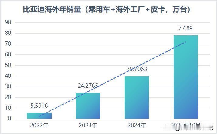 比亚迪海外市场的增长曲线,正书写着“加速度”的故事:从2022年5.6万台的年销量,到2023年、2024年接连突破24万、39万,再到2025年前10月已冲上77.89万台,年销量的阶梯式跃升,是全球市场对其产品力的投票。 而月销数据更藏着细节:2025年每月的海外销量,已稳定甩开2024年同期水平,单月规模逼近9万台。从“初涉海外”到“站稳脚跟”,比亚迪的出海节奏,正从“试水”转向“深耕”。 总结: 1. 2022年:海外年销5.5916万台,为出海初步布局阶段  2. 2023年:年销跃升至24.2765万台,实现首次大幅突破  3. 2024年:年销达39.7063万台,延续高速增长态势  4. 2025年前10月:累计销量77.89万台,月销稳定领先往年同期,出海规模进入爆发期