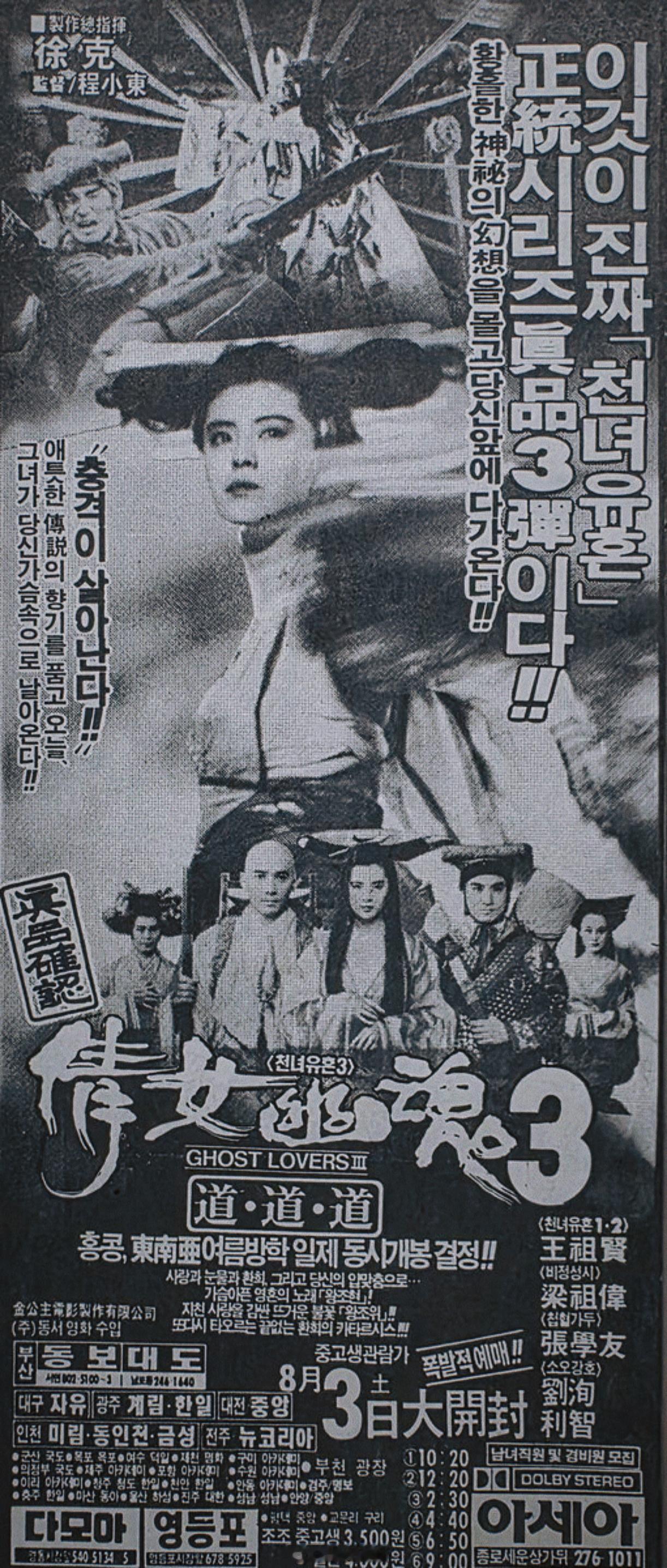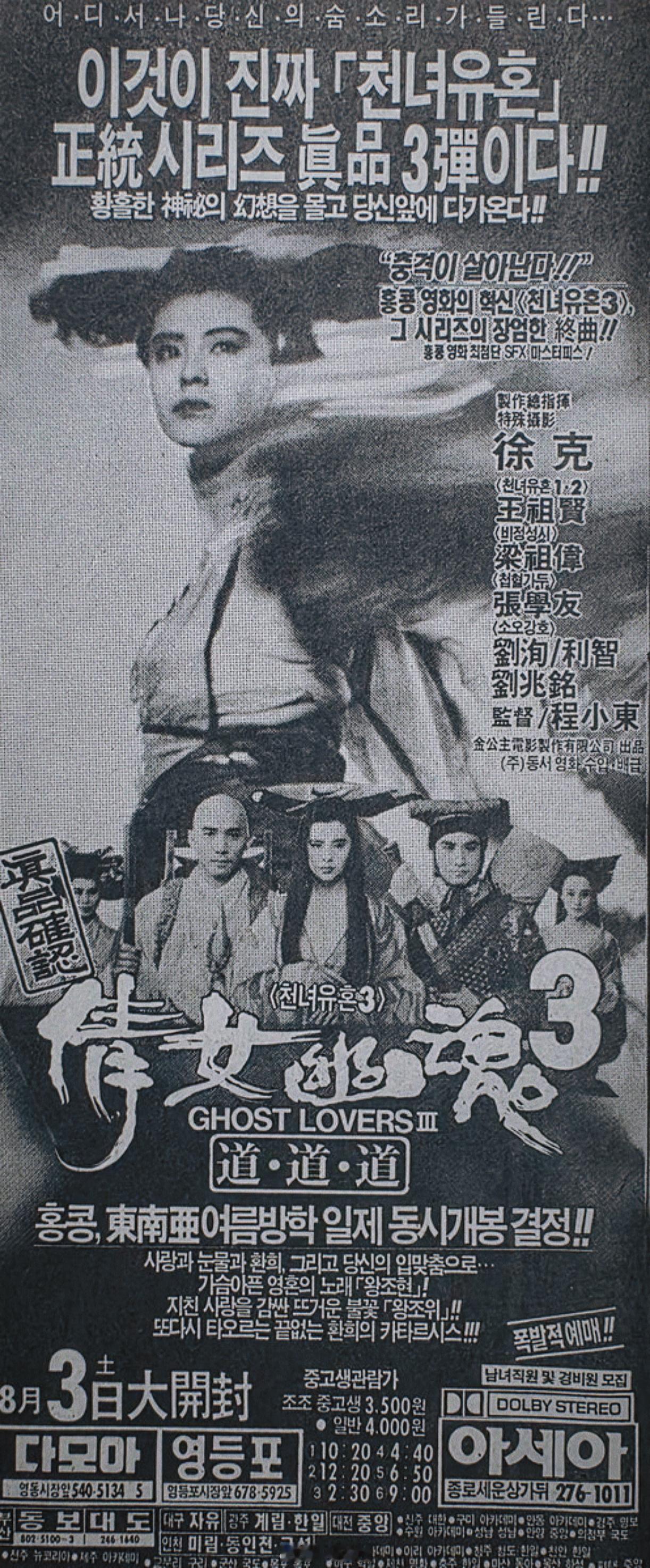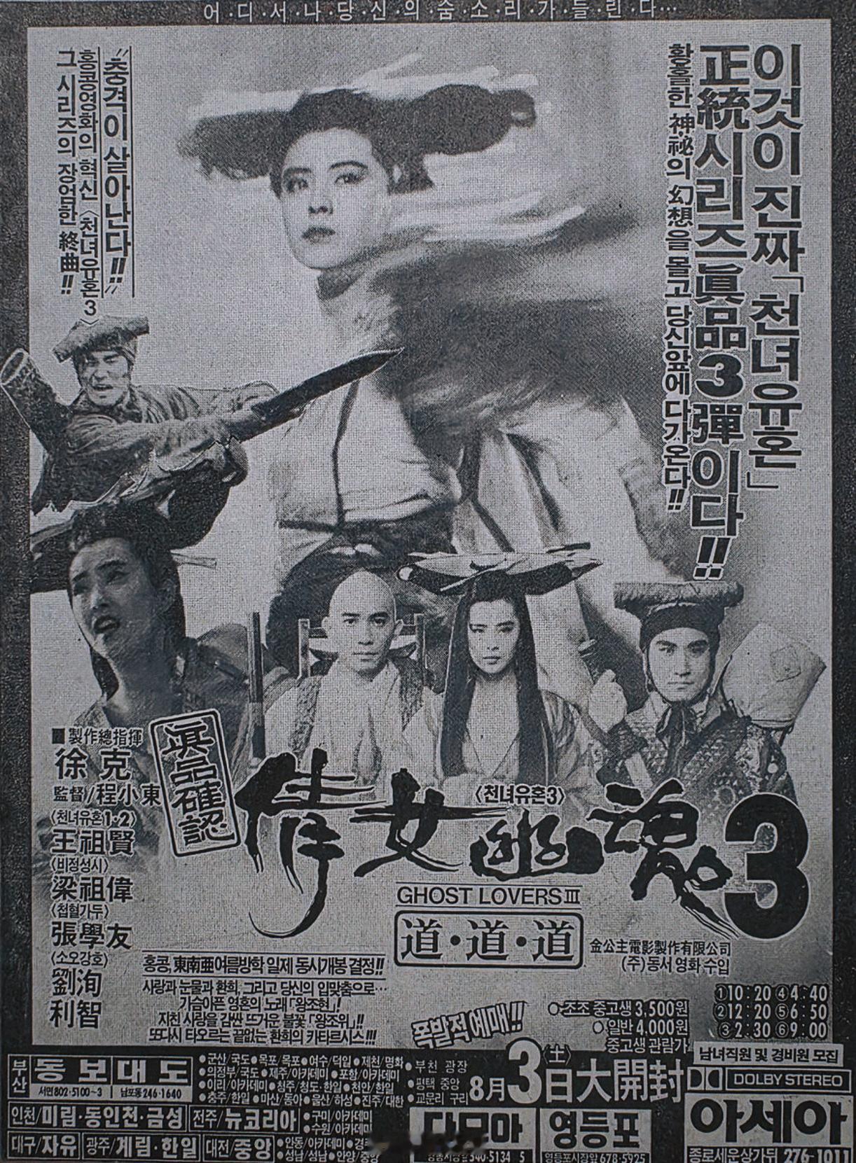 王祖贤[超话]故纸堆“真品确认”,王祖贤、梁朝伟、张学友、利智主演【倩女幽魂3之道道道】,韩版海报王祖贤 ——王祖贤是当年港片销售日韩海外市场的“卖埠灵”,画幅最大自然是她,飘曳的小卓[酷]💖~佳片奇遇季 “倩女”系列的官方英文片名都是“A Chinese Ghost Story”,“一个中国鬼故事”,但看海报上,韩国用的翻译则是“Ghost Lovers”,“鬼之恋人”,也挺有趣。