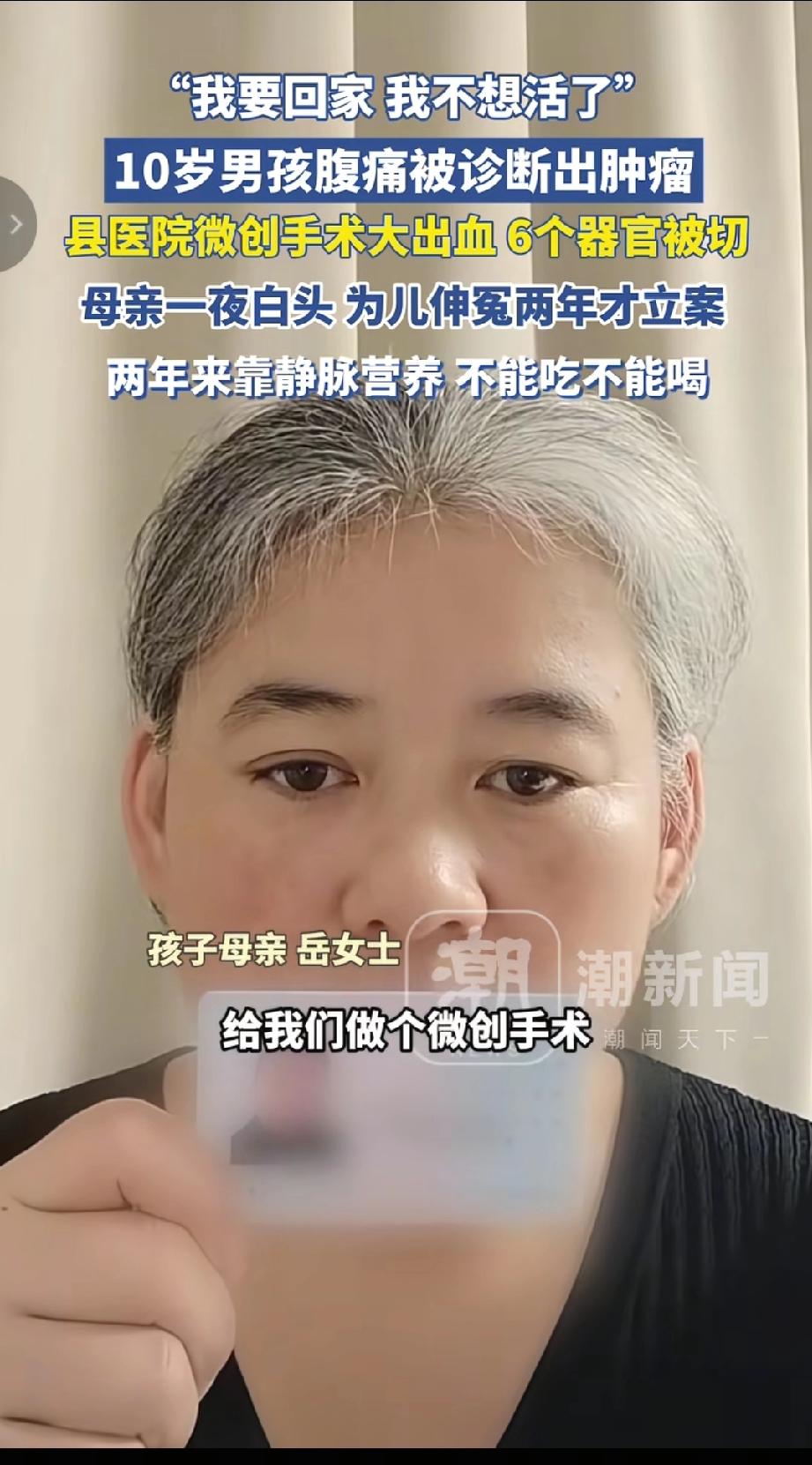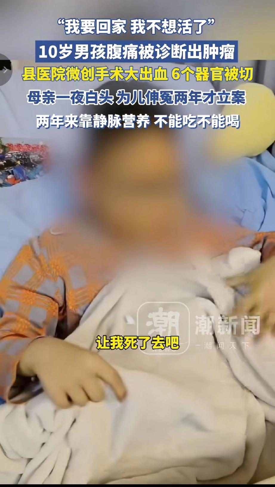 “妈妈,我想回家,我不想待在这里,让我死吧。”一个稚嫩又绝望的声音,如针般刺痛着我们的心,而这竟出自一个年仅10岁小男孩之口。原本天真活泼的他,只因一场突如其来的腹痛,命运便被彻底改写。 小男孩被诊断出肚子里长了肿瘤,家人心急如焚又心存一丝希望,将他送进了县医院。当时医生满不在乎地说,这只是个小毛病,做个微创手术就能解决。谁能料到,这看似简单的微创手术,竟成了噩梦的开端。 手术台上,意外突发,大出血的状况如恶魔般袭来。原本计划的微创手术,不得不转为开腹手术,接着又是十二指肠切除术、结肠切除……一场手术,宛如一场无情的风暴,席卷了孩子幼小的身体。家属们心急如焚,在医生“不签字就是不配合医治”的逼迫下,被迫4次签下那沉重的名字。 最终,这场手术让孩子的身体系统几乎遭受了灭顶之灾,6个器官被无情切除。胃被切去了三分之二,结肠只剩下不到50厘米。看着孩子遭受如此折磨,母亲心如刀绞,乌黑的头发竟全白了,仿佛那无尽的忧愁与痛苦,都化作了这满头白发。 此后的两年时光,对孩子而言,每一天都是煎熬。他不能吃,不能喝,只能无奈地挂着排泄带,依靠静脉营养维持那脆弱的生命。那小小的身躯,承受着常人难以想象的痛苦,他常常哭着说:“我不要再戴这个了,让我死了去吧。”每一句话,都像一把利刃,刺痛着母亲的心。 好在,正义或许会迟到,但不会缺席。山东成武卫健局认定医院存在问题,已经立案调查。红星新闻10月29日从孩子母亲岳女士那里获悉,当时那场手术,竟然持续了将近14个小时。这漫长的14个小时,对于孩子和家人来说,每一分每一秒都是煎熬。 目前,县医院已经赔偿了20万元,县卫生健康局也在紧锣密鼓地进行立案调查。我们真心希望,这样的悲剧不要再上演,也期待调查能早日有一个公正的结果,还孩子和家人一个公道,让这个饱受磨难的家庭早日好起来!