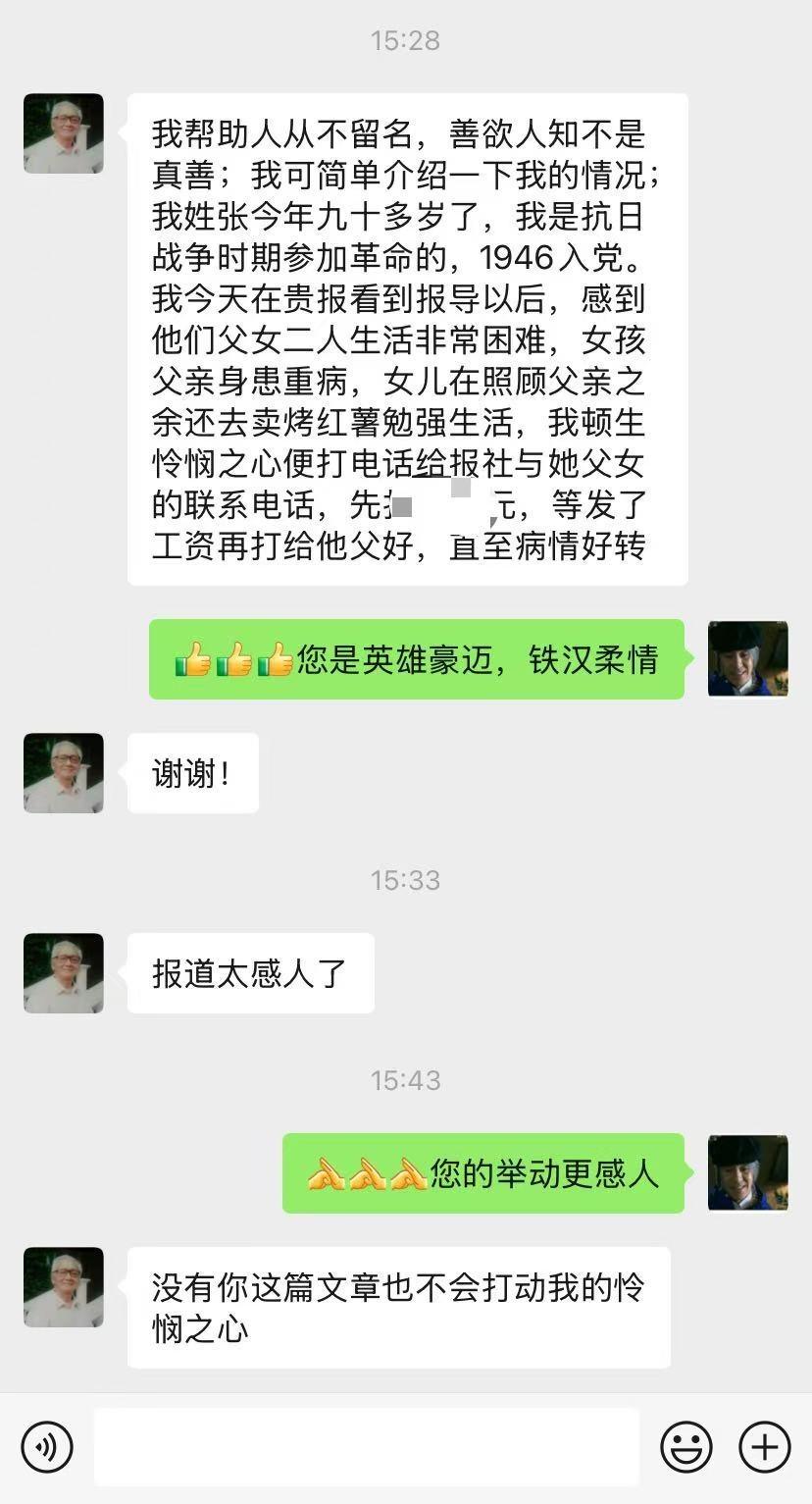 11月1日中午,一位读者拨通合新闻热线电话称,自己看到合新闻刊发了一篇安徽女孩吴亚春摆摊卖烤红薯救患病养父的报道,希望联系到那位女孩,给予帮助。在合新闻的帮助下,双方已互相取得联系。 今年5月,吴亚春的养父被查出患有食道癌,面对这一突如其来的变故,她毅然决然地辞去了在厦门的幼师工作,返回安徽老家,全心全意陪伴养父抗击病魔。 吴亚春与父亲的日常照片。 在父亲住院治疗期间,失去了经济来源的吴亚春并未气馁,而是开启了摆摊生涯,一边悉心照料父亲,一边利用空余时间售卖烤红薯,以维持生计。 同时,她借助自媒体平台分享日常生活点滴,吸引了众多网民的关注,大家无不被她的勇气与乐观精神所打动。 合新闻对此进行采访和深入报道,报道后获安徽主流媒体广泛传播,“安徽女孩厦门辞职回家卖红薯陪养父抗癌”“合肥街头有个卖红薯的大孝女”等话题以20万的传播量登上微博合肥同城榜第二、厦门同城榜第一,并引发更多好心人士的关注。 此次表示想要捐助的好心人士,是住在包河区的一名90多岁的抗战老兵,老人家姓张,不愿意透露自己姓名,他告诉合新闻记者,自己看到报道后,觉得十分感人,感到父女二人生活非常困难,自己顿生怜悯之心,便想要帮一把。 因为年龄大,张爷爷听力下降,咨询合新闻的电话还是请家政阿姨打的,帮他转达了想要帮助的意愿。 合新闻记者随后加上张爷爷的微信,用文字与老人家沟通。“没有你这篇文章也不会打动我的怜悯之心。”张爷爷说。 当天下午,合新闻记者从女孩吴亚春处获悉,张爷爷决定每个月都会捐赠一笔钱给她,直到她父亲出院。 吴亚春对张爷爷伸出援手表示十分感谢,“我正在努力挣钱,您的这份恩情我谨记在心。”同时她还表示,“只有这份帮助是在张爷爷力所能及、不影响自身生活的情况下,自己才会接受。” 吴亚春在摆摊卖烤红薯,旁边架着手机直播。 同时,不少媒体和热心人士联系合新闻,想要知道女孩的联系方式和摆摊地点。善意,在合肥流淌;温暖,悄然传递;改变,正在发生…… 合新闻见习记者 施院生