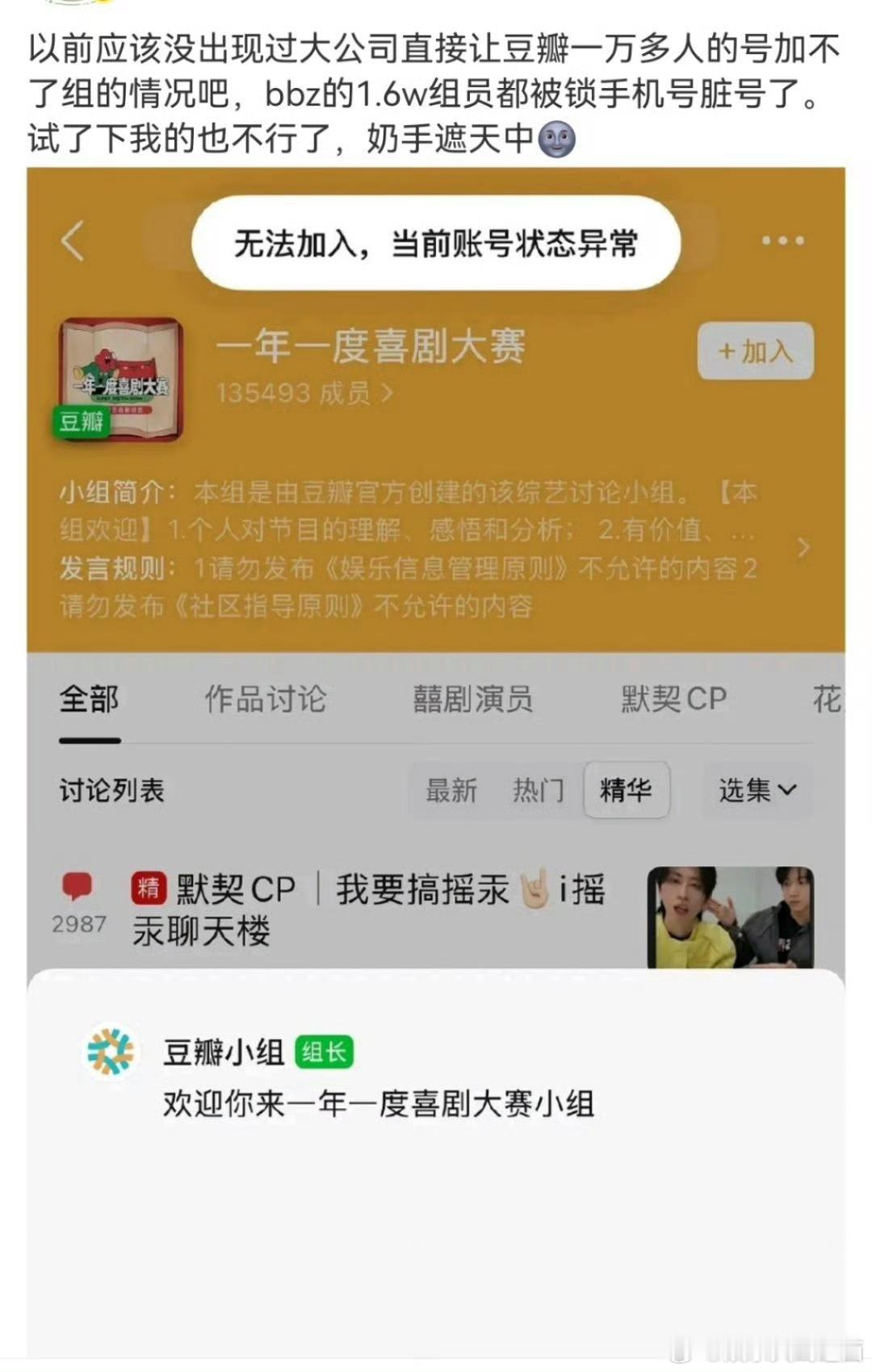 以前应该没出现过大公司直接让豆瓣一万多人的号加不了组的情况吧,bbz的1.6w组员都被锁手机号脏号了,🌸🚽大公司奶手遮天中.....