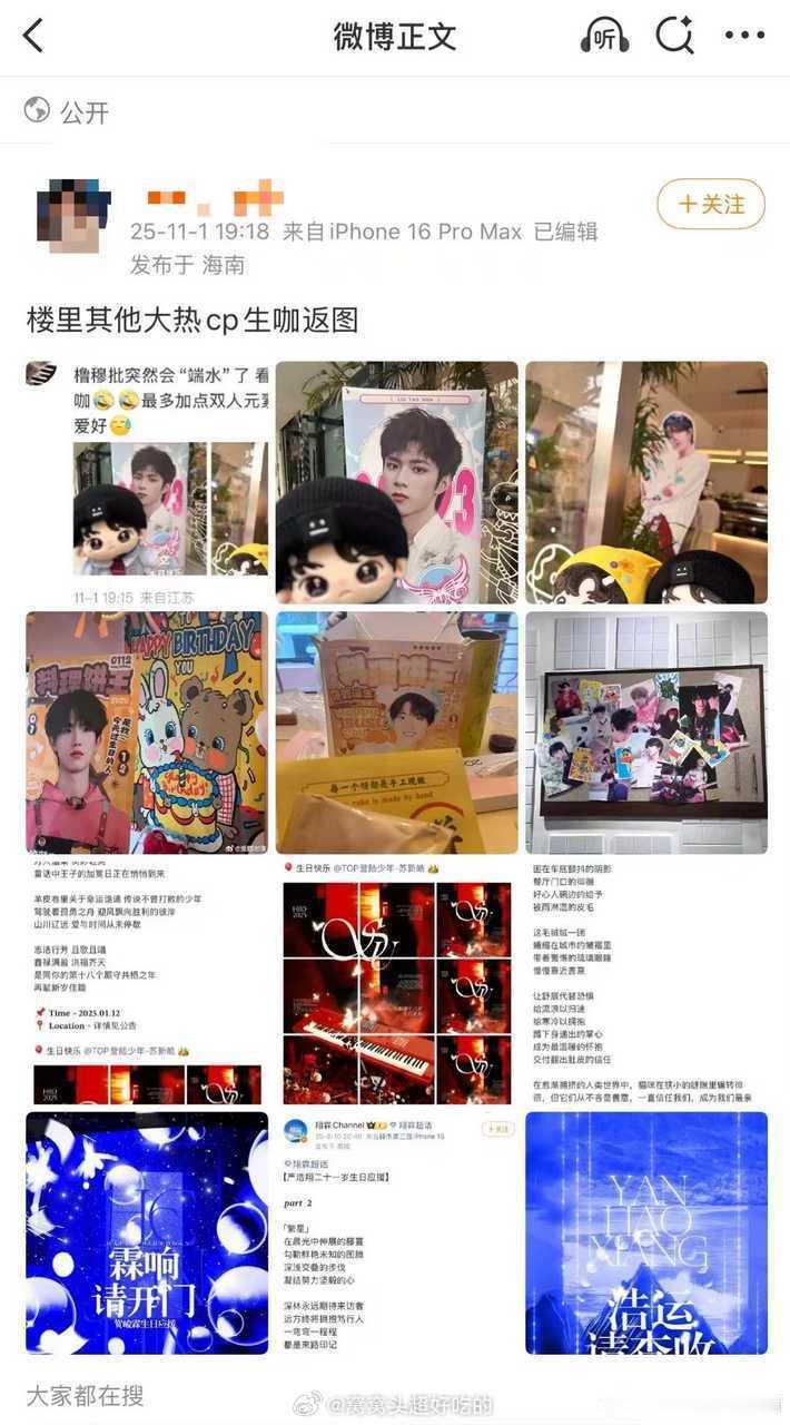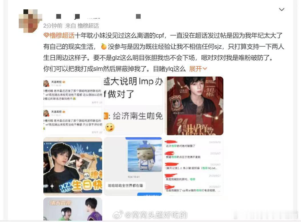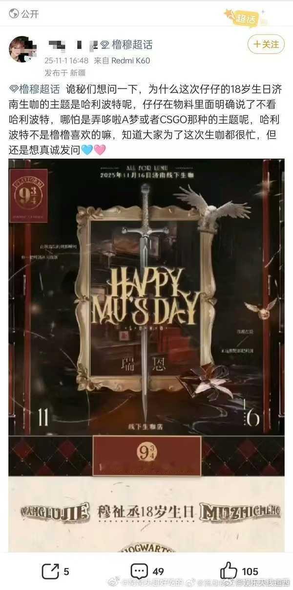 楼内国二跨代橹穆CP超话管理组歪屁股好厉害。师兄穆祉丞过生日,超话里却夹杂大量师弟单人应援,甚至把寿星照片压到不显眼的位置;办生咖还特意选了穆祉丞没看过、但师弟偏爱的哈利波特主题。