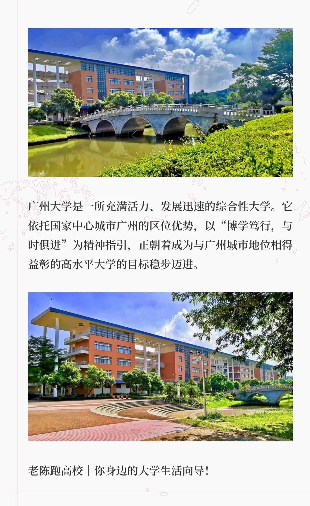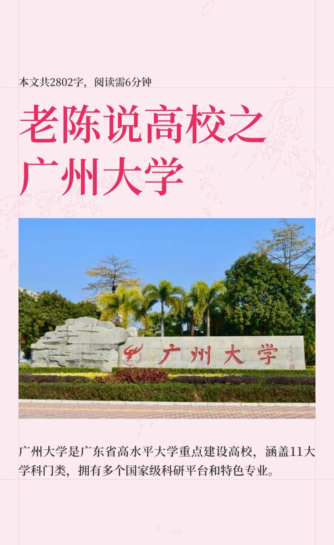 老陈说高校壹捌肆拾期之广州大学 广州大学是广东省和广州市高水平大学重点建设高校,拥有11大学科门类,涵盖26个学院,73个本科专业。学校以“博学笃行,与时俱进”为精神指引,致力于培养高素质人才,服务粤港澳大湾区建设。高校 大学 院校规划 广州大学 广州大学城 欢迎报考 院校推荐