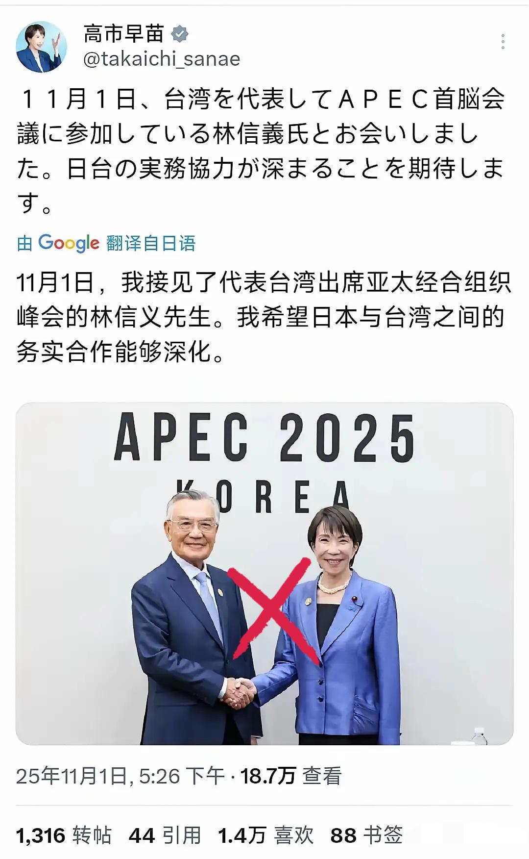日本首相高市早苗今天(11月1日)傍晚写道:“11月1日,我接见了代表台湾出席亚太经合组织峰会的林信义先生。我希望日本与台湾之间的务实合作能够深化。” 她可不是私下见个面,而是连续两天在社交平台晒照片、炒热度,用心太险恶。她居然叫林信义“总统府资政”,这是公然挑战一个中国原则,性质极其恶劣。 中方的回应快得很,直接定性“严重错误”,外交部第一时间就提出了严正交涉和强烈抗议。红线就是红线,碰了必然有反应。 高市早苗这操作绝非偶然。她本就是右翼强硬派,11次参拜靖国神社,还否认过南京大屠杀,对台湾问题一直不安分。 她一边喊着重视中日关系,一边把防卫预算提到GDP的2%,还想废和平宪法搞进攻性武力,典型的两面派。 这次在APEC搞事情,算盘打得精。无非是讨好国内右翼稳固政权,再配合美国印太战略牵制中国。 可她忘了最基本的事实。台湾是中国领土,这写在中日四个政治文件里,是国际社会公认的底线。 日本曾殖民台湾半个世纪,在这个问题上本就有罪责,现在居然还敢挑事,简直是毫无历史敬畏心。中国是日本最大贸易伙伴,2024年占其出口市场的20.5%,真闹僵了日本经济扛得住吗? 这种“又想赚中国钱,又想踩中国红线”的贪心,根本行不通。天下哪有这么好的事?连日本国内都有人骂她“激进过头”,担心破坏中日关系影响经济复苏。台湾网友更清醒,直说“被当棋子耍”。 前阵子日本前防相还喊着“台海有事就出兵”,现在高市早苗又来挑衅,这是在把地区安全往火坑里推。但他们真有底气?美国智库推演过,就算美日联手,中国三周内仍能占据优势,日本只会遭重创。 台湾问题是中国内政,核心利益中的核心,容不得半分干涉。这不是空话,是一次次反制行动证明过的。高市早苗必须为错误买单,纠正言行、消除影响,这是唯一的出路。别想着蒙混过关。 各位读者你们怎么看?欢迎在评论区讨论。