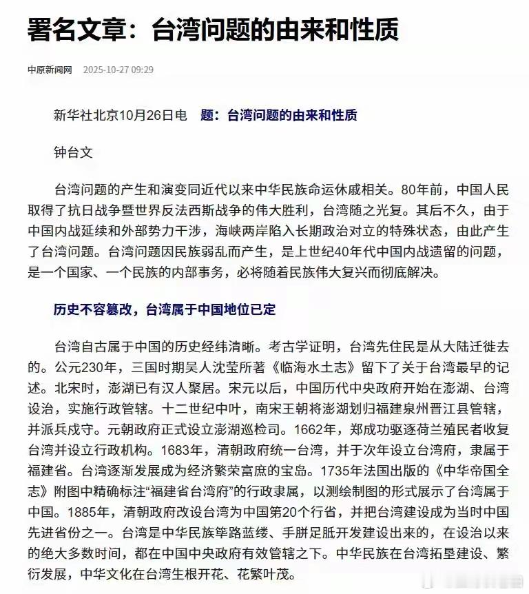 而最重磅的,当属新华社连续三天推出的千字长文,署名“钟台文”的文章从历史、政治、经济、文化、法律、军事等各个维度,把台湾问题讲得明明白白。