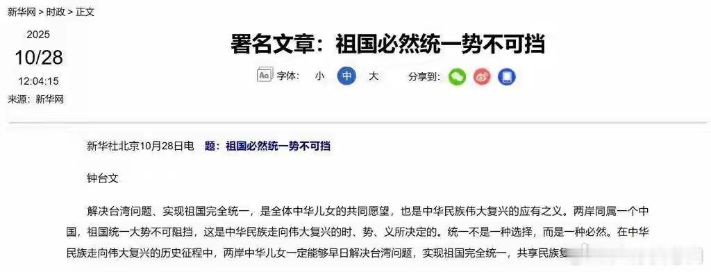 10月26日起,“钟台文”的三篇文章陆续发布,逻辑链条清晰到让人无法回避,一步步把台湾问题的核心和解决路径摆在台面上。