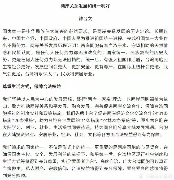 文章详细阐述了统一后,台湾的经济会得到更广阔的发展空间,民生会更有保障,两岸同胞可以共享民族复兴的红利。