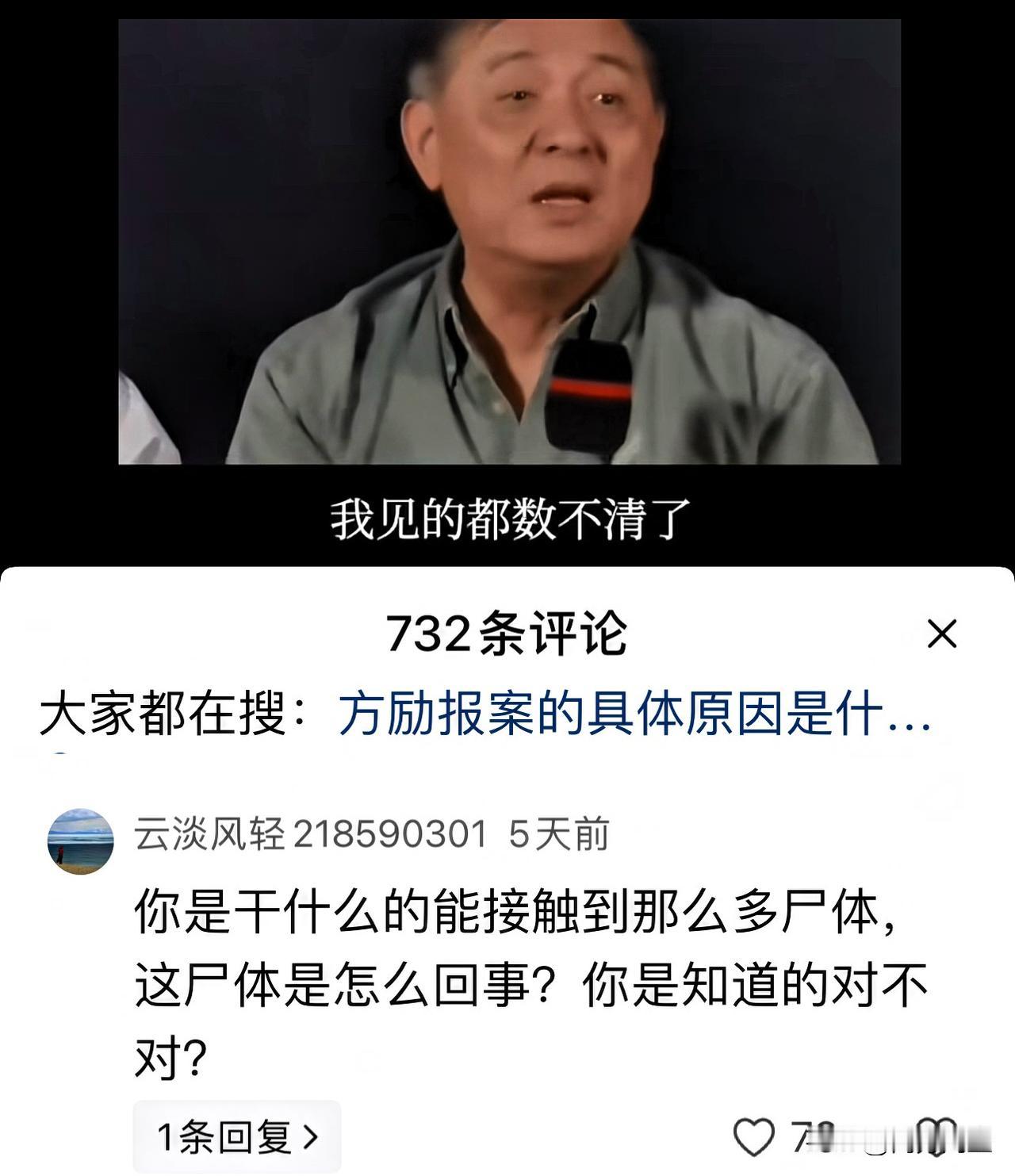 方励自称手上接触过上百个尸体,他究竟干过什么工作? 方励:人间的丑恶,人间的罪案,甚至死亡的尸体,我见的都数不清了,我手上接触过的尸体都是拿百来记的,我见过的枪林弹雨、冤案,数都数不清,包括我现在还在牢记里的同学,,冤案不是一个两个。 此外,电影所呈现的远不及真实世界惨烈。 方励这番话颇具恐怖片的惊悚意味,看来,他对现实社会颇为不满。究竟是怎样的经历,才让他说出如此悲观隐晦之语。 郑智化已就“连滚带爬”的登机描述作出解释,称那并非事实,只是情绪化的表达。 方励在镜头前的这番言论,是真还是假?是情感抒发,还是真实叙事?
