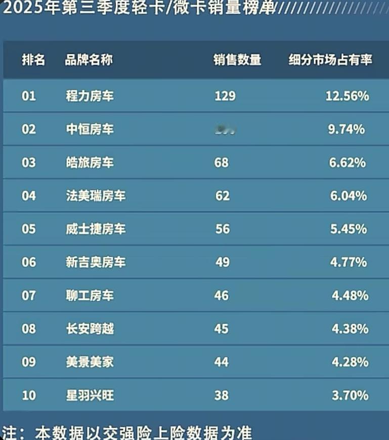 2025年第三季度轻卡/微卡底盘、房车市场榜单出炉! 底盘端,重汽豪沃统帅以361辆、35.15%的份额稳居榜首,比亚迪T5以184辆跃居第二,占比17.92%; 房车品牌中,程力房车以129辆、12.56%的占比领跑,中恒房车、皓旅房车紧随其后。 数据以交强险上险量为依据,既体现了传统底盘品牌的稳固优势,也彰显了新能源底盘与新兴房车品牌的上升势头。