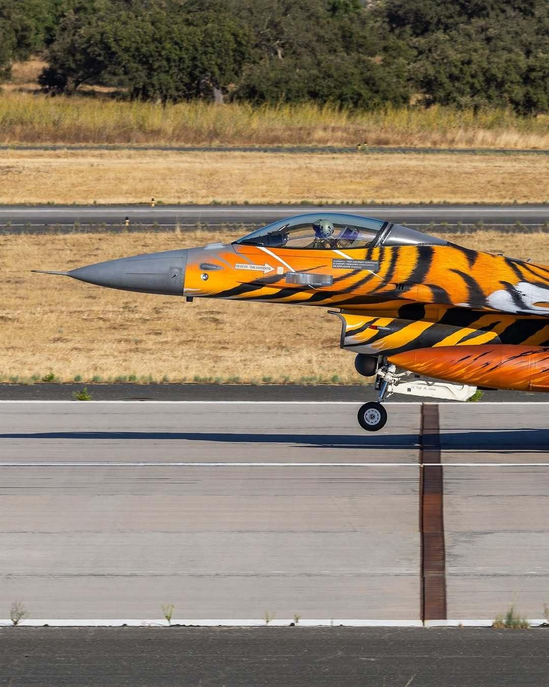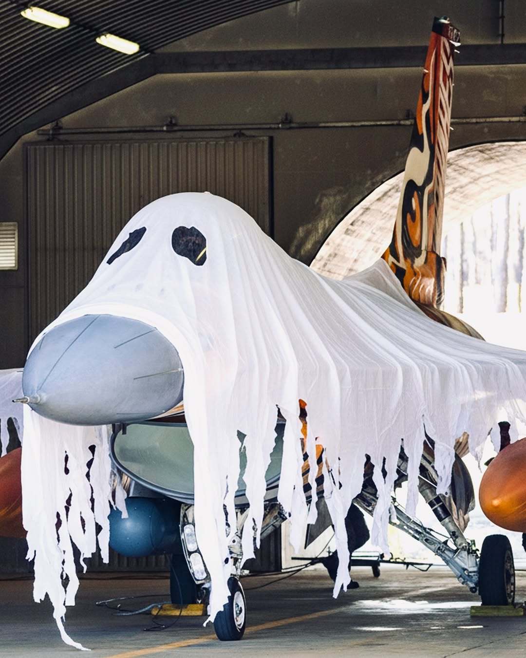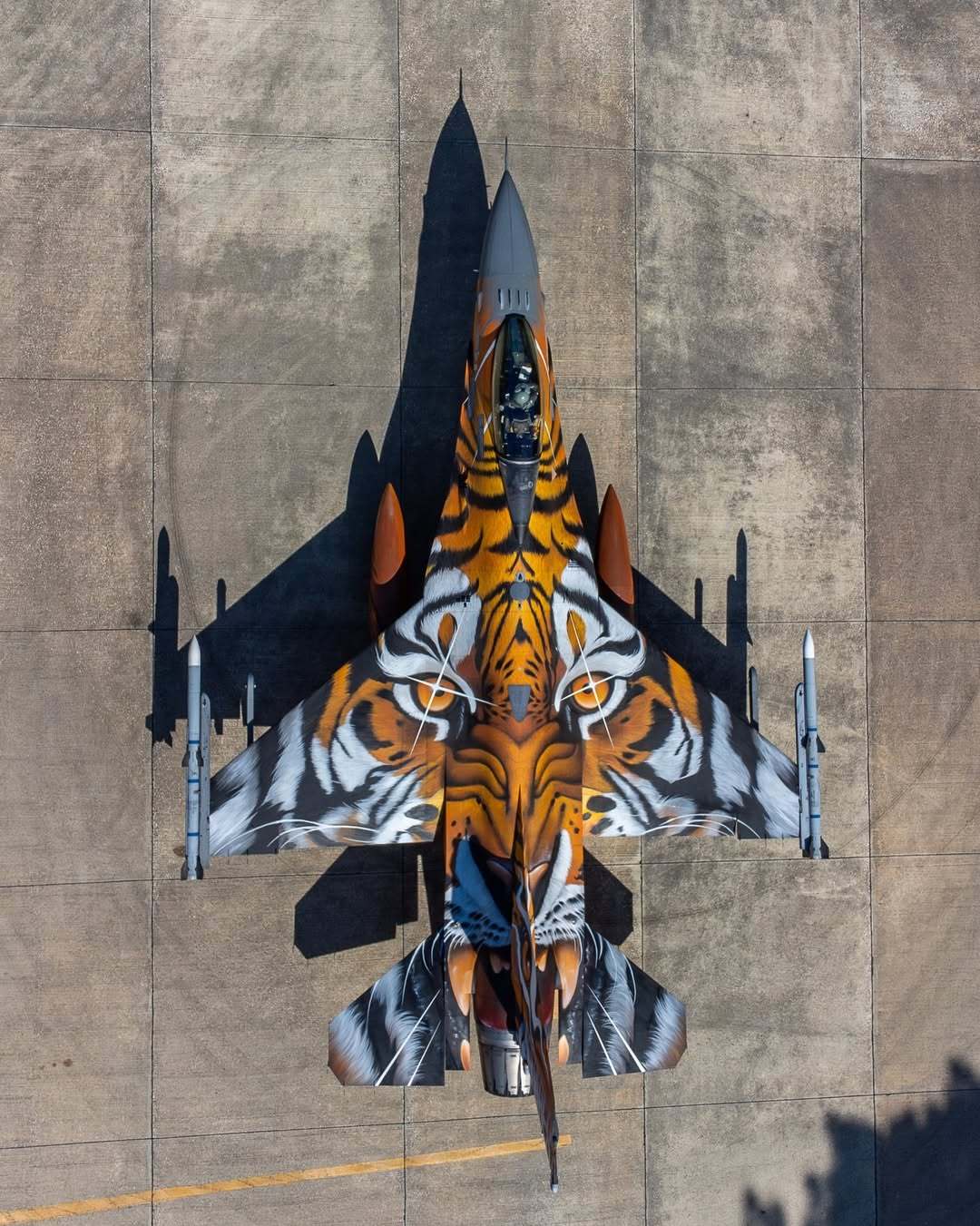 葡萄牙空军第301“美洲豹”中队的F-16战斗机万圣节 装扮,这架F-16还参加过北约老虎会活动,因此喷涂了特色的老虎涂装