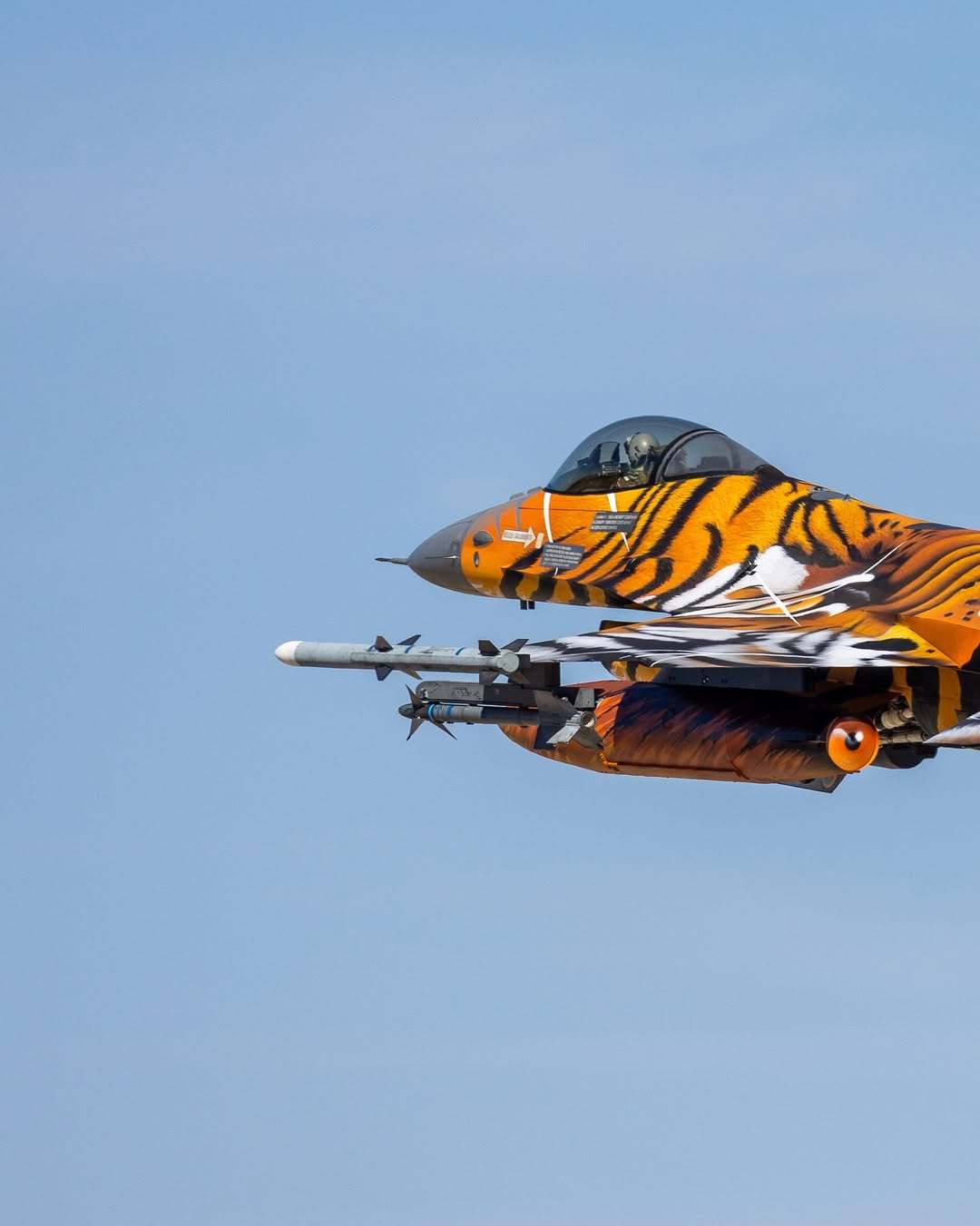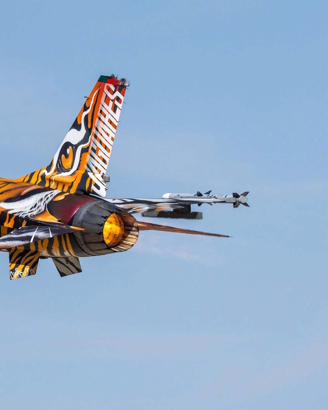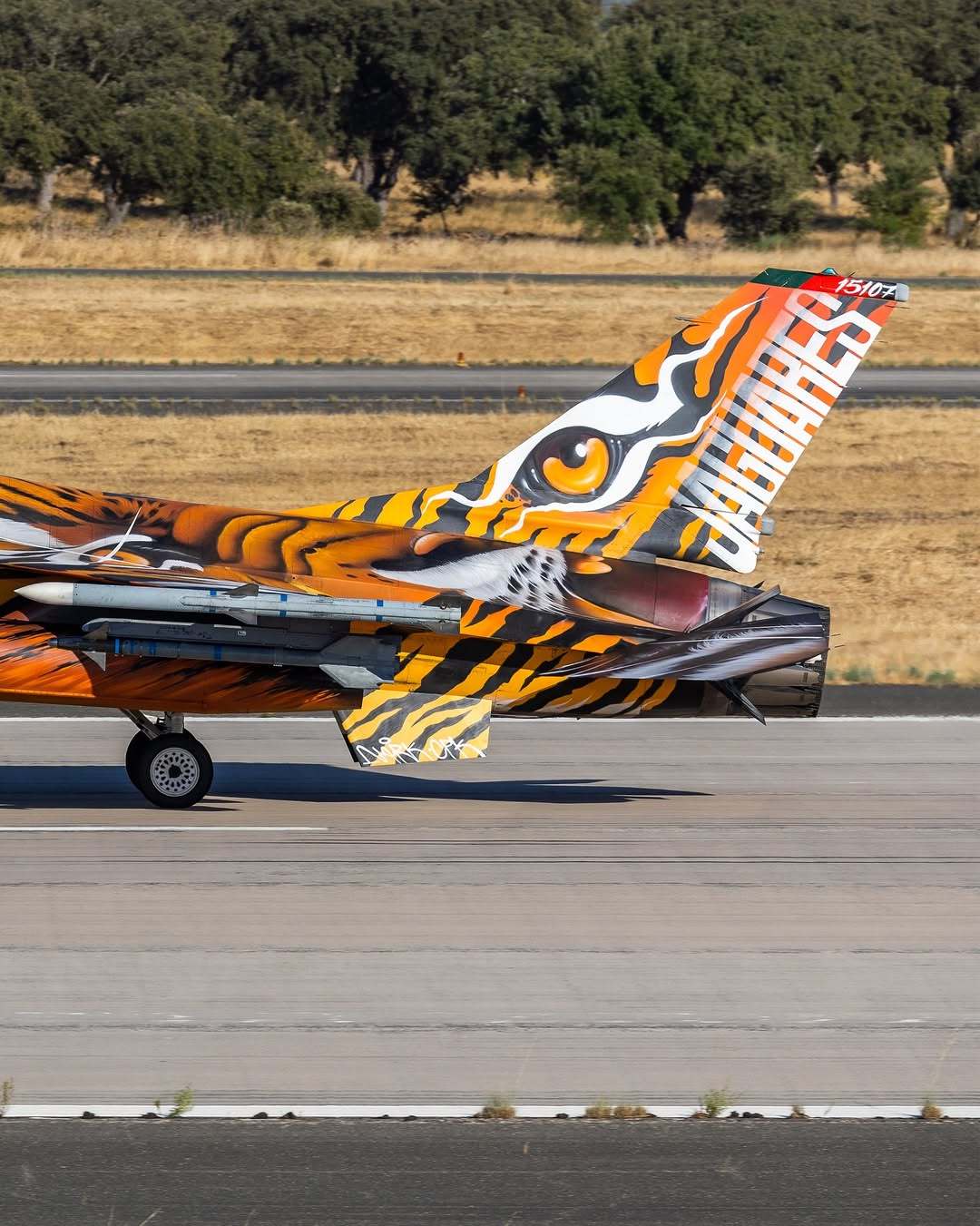 葡萄牙空军第301“美洲豹”中队的F-16战斗机万圣节 装扮,这架F-16还参加过北约老虎会活动,因此喷涂了特色的老虎涂装