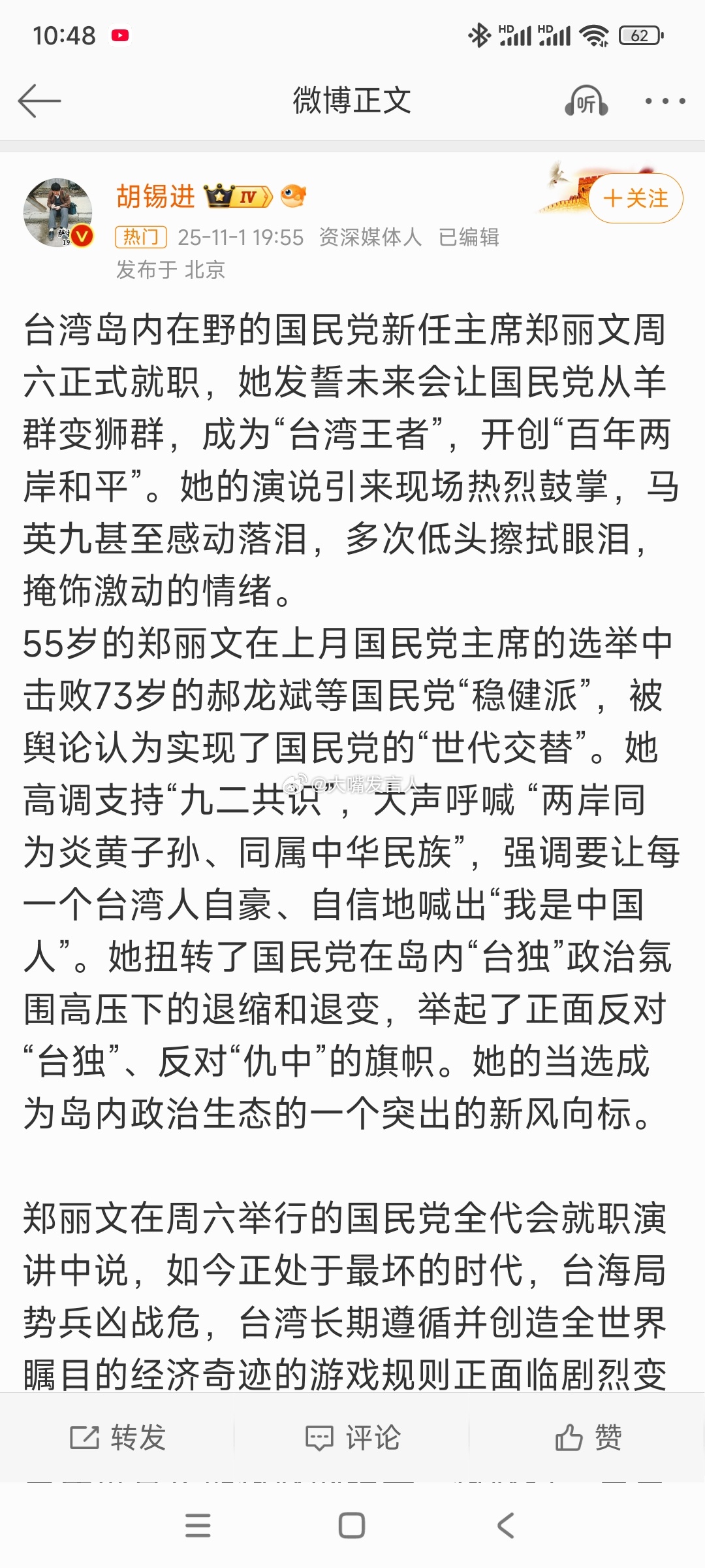 个人感觉不要太乐观了,郑丽文统一的条件是,和平统一,2300万台湾人必须同意情况下才能统一,必须一国两制,她说统一是很复杂的事情,要有一个循序渐进的过程。大家细品这些话,跟马英九的不统不独不武有什么本质上的区别,只是披上了一件漂亮的外衣