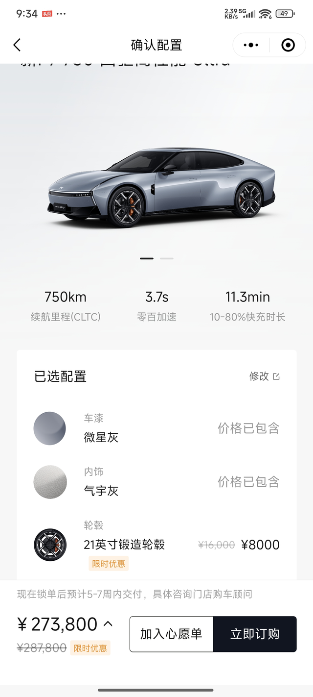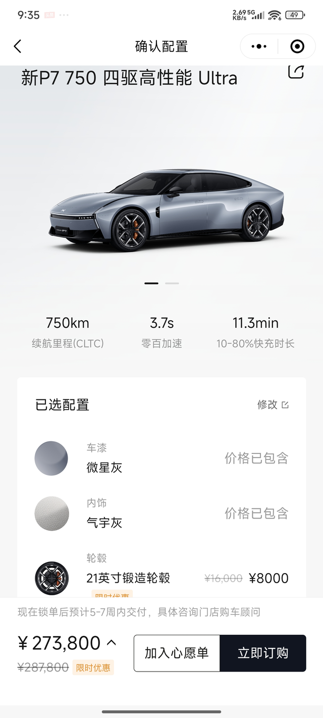 小鹏p7试驾后果断放弃 全新小鹏p7这款车我关注很久,发布前就被谍照深深吸引了,感觉非常的科幻和未来,颜值很高。所以上市之初我就到4s店进行了深度试驾,试驾后果断放弃。 ⭐让我喜欢的优点: ❶造型:造型科幻未来,是这辆车的最大卖点。看到实车的正脸、侧身感觉要比图片中更具有科幻感。特别是试驾车的金属钛色,感觉就像未来宇宙飞船的颜色一样。侧面看虽然车身有棱有角,但是还是给人一种流畅之美,只到了尾部往下溜的造型,感觉暨有力量感,又有运动感。 ❷操控:坐进车内第一感觉这辆车的坐姿很低,就像开超跑的感觉一样,全感觉不到电池包的厚度,所以还未启动就已经把战斗氛围给营造满了。开起来的感觉和他的造型一样运动,方向盘灵敏性很高,指哪打哪没有一点儿虚位,油门调教也比较激进,属于轻轻一点,就动力十足的。刹车脚感特别好,和第一代p7一样,是我开过刹车脚感最好的车型之一。 ⭐让我放弃的缺点: ❶空间:前排空间还好,但是后排空间实在无法接受。我身高1米8,坐在后排竟然顶到了头,由于前排的座椅过于低矮,脚背无法伸进前排座椅之下,浪费了腿部空间,长时间乘坐很不舒服。我选车主要是家庭用车,所以后排空间我果断放弃的最重要原因。 ❷尾部:尾部造型从侧面看还好,但是从正后方看,有点太过于方正,过于平直,感觉就像一个皮卡加了一个盖一样。不认识车的很可能以为你开了一辆皮卡,不但不运动,而且还廉价。 ❸售价:用APP进行了初步的选配,因为小鹏毕竟是一辆很运动的车,所以我必须选最高配四驱车型,加上选装轮毂等,选装完之后的价格竟然高达273800元,价格我感觉有点偏高。 ⭐总结: P7是一辆好车,运动属性特别强,优点特别突出。但是他的空间短板又很短,会劝退了很多家庭用车的客户,使大家不得不放弃。