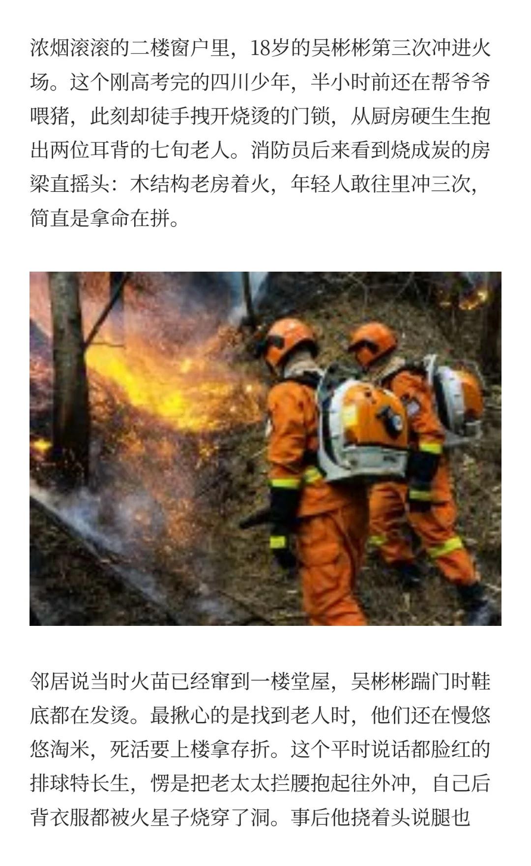 18岁少年三闯火场救出七旬夫妻 6月19日上午,四川蓬溪县常乐镇崇文村18岁高三毕业生吴彬彬发现邻居家二楼起火,三闯火场救出听力障碍的七旬夫妻,并冒险关闭电闸。刚高考完的他踹门搜寻,先后抱出两位行动不便的老人,火势随后吞没堂屋。当地正为其申报"见义勇为"称号,被救老人家属已登门致谢。 这场火场救援引发全网点赞,"高考少年三闯火场"、"话题阅读量破亿"。网友感慨"善良比分数更重要",也有人提醒"救人的同时要注意自身安全"。事件暴露出农村留守老人安全隐患,消防部门借此呼吁普及火灾逃生知识,强调"生命至上"原则。高考少年三闯火场 话题阅读量破亿 热点 热点新闻事件 救人与危难 泪目 心有一团火温暖众人心 振奋人心热血沸腾 感人