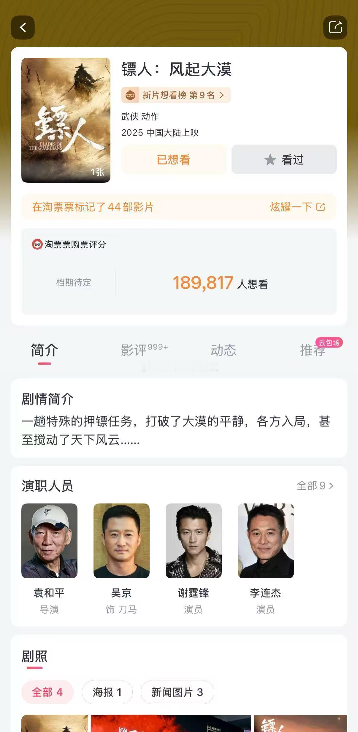 镖人 《镖人》今天横店推介会这波感觉大事很妙啊,武侠题材配上超绝能打阵容真没得说,这年头太想看点硬桥硬马实打实的功夫打戏了!!!两个平台“想看”都已狠狠点好,片方能不能快点看看我们想看到爆炸的心啊!求定档!求官宣!燥候!!!镖人看点推介