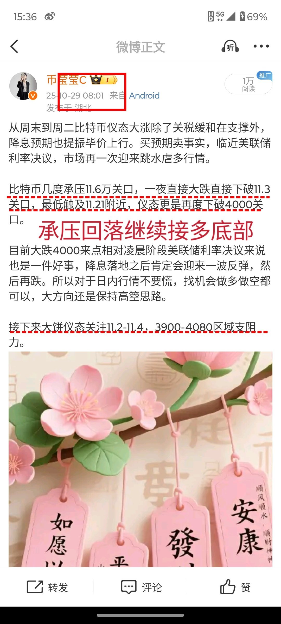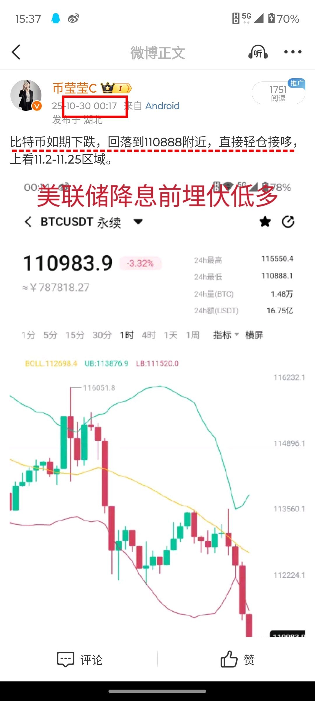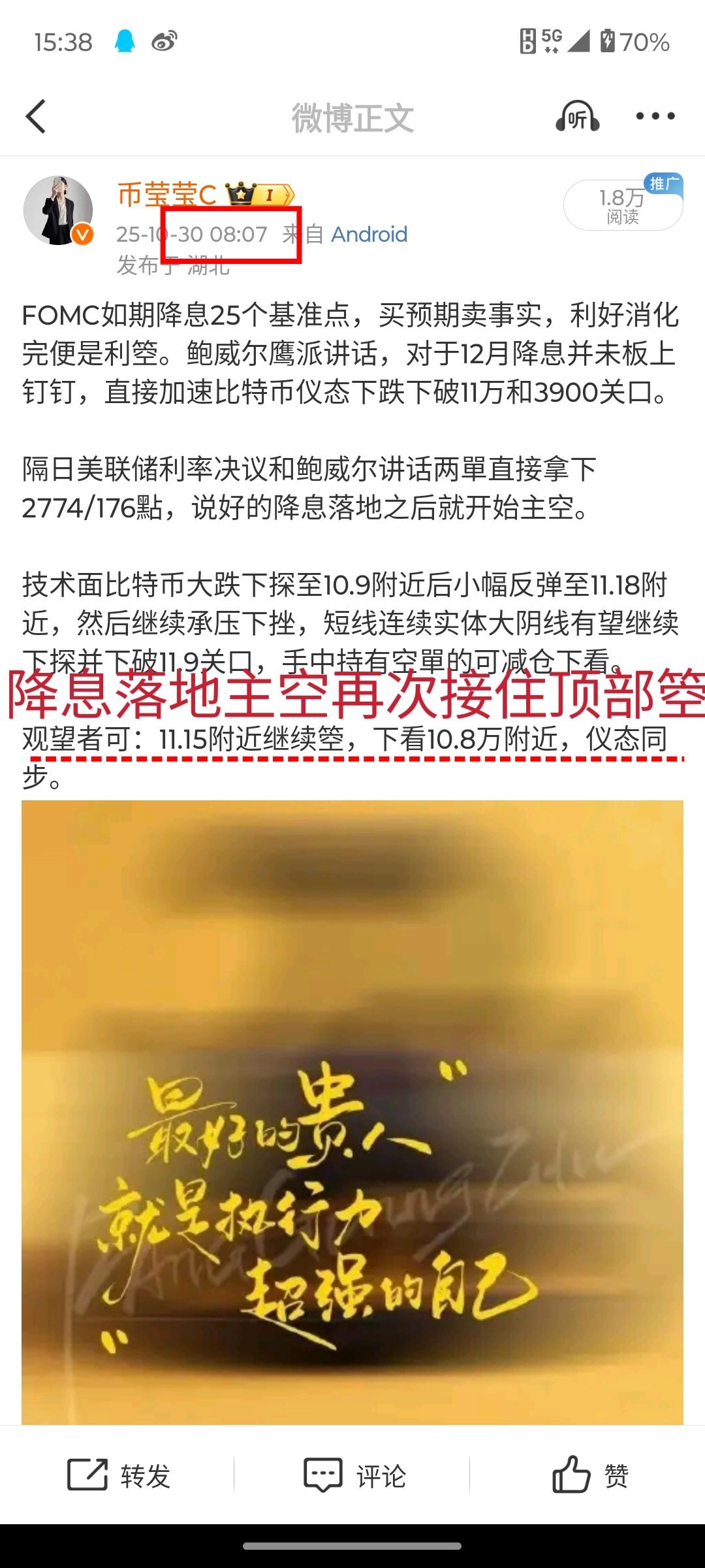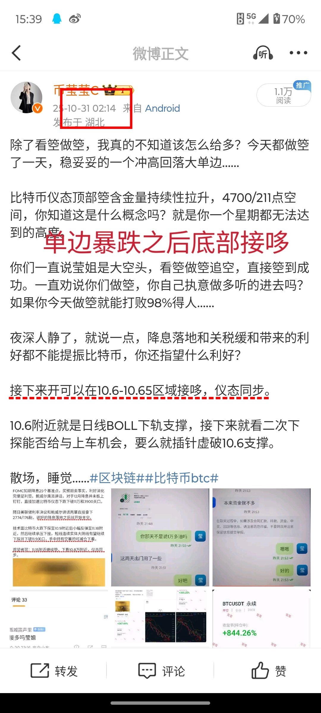 周四降息落地和鲍师傅鹰派讲话以后,莹姐都强调了主空,再一次在11.15万附近顶部做箜,单边性下跌,下方直接下探至10.6万附近,整个过程我没有给与任何的多單,一路看空向下乃至内部学员追空都能大获全胜。